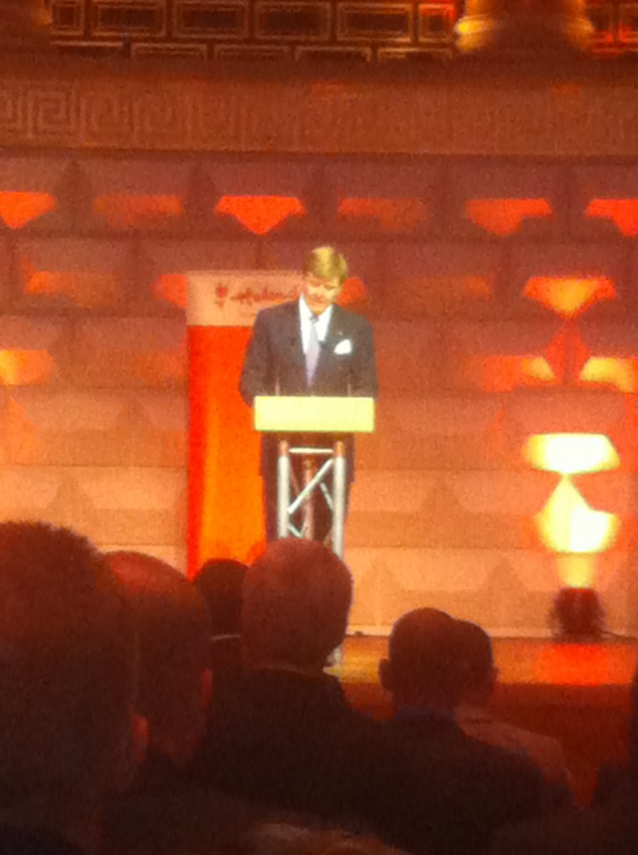 Aansluitend is er een groots 'flying diner' en dat betekent weer, zoals gedurende de gehele dag, staan aan een tafel en converseren met een caleidoscopische groep mensen. Uiteindelijk wordt ook onze tafel vereerd met een bezoek van de koning. De voertaal is Duits, het is saillant dat de eerste en waarschijnlijk de laatste keer dat ik Koning Willem Alexander mag spreken het in de Duitse taal is. Hij neemt de tijd om iedereen een hand te geven en iedereen te spreken, ook al wordt hij door ambtenaren gemaand op te schieten. Ook ik krijg een minuut voor een elevator pitch. Naderhand doen wij ons te goed aan Nederlandse kazen en hebben wij een aantal geanimeerde gesprekken met hartelijke Duitsers en tot slot ook even Minister Bussemaker. We hebben het over de rol die architectuur kan spelen voor Nederland en welk beleid daarbij past. Naarmate de Riesling vloeit, wordt mijn Duits allengs beter...vermoed ik. Genietend van de avond wandel ik tevreden naar het hotel.