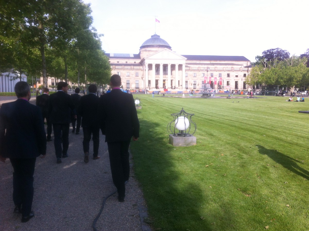 De kop is er af! Na een vertraagde vlucht van Schiphol naar Frankfurt zijn we eindelijk gearriveerd in Wiesbaden, de Duitse bakermat van het huis Oranje Nassau. Vanochtend is de Nederlandse handelsmissie van start gegaan in het gebouw van de Industrie- und Handelskammer, een van de neoclassicistische hoogtepunten die deze stad sieren. Minister Ploumen gaf met haar speech het startsein voor een dag die zich kenmerkt door een intensieve kennismaking van Nederlandse bedrijfssectoren met hun potentiële Duitse handelspartners. Voor onze delegatie van de BNA betekent dat een ontmoeting met de architeketenkammer van Wiesbaden. Een ontmoeting met Duitse collega's dus en voor mij een presentatie van atelier PRO in een Pecha Kucha sessie in mijn gebrekkigste Duits. Aanwezig is de zeer in architectuur geïnteresseerde Minister van Onderwijs, Cultuur en Wetenschap Jet Bussemakers. Ik bevind mij in het gezelschap van gerennomeerde architectenbureaus: Onix, Ector Hoogstad, MVRDV, Benthem  en Crouwel, KAW, UN studio, Studioninedots en BDG Architecten. Kortom een gezelschap van competente bureaus die in Duitsland aan de bak willen, of al jaren zijn.