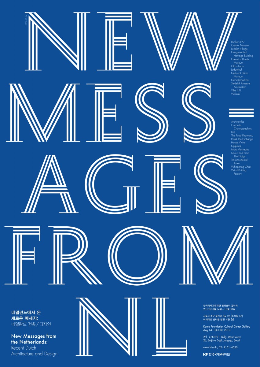 Organized by a government affiliated organization, the Korea Foundation, the exhibition "NEW MESSAGE" will emphasize not only on the end product but mainly focus on the concept and the value of the process of design and architecture of the Netherlands. The title of the exhibition is the "New Message from the Netherlands" with "NEW:USE".