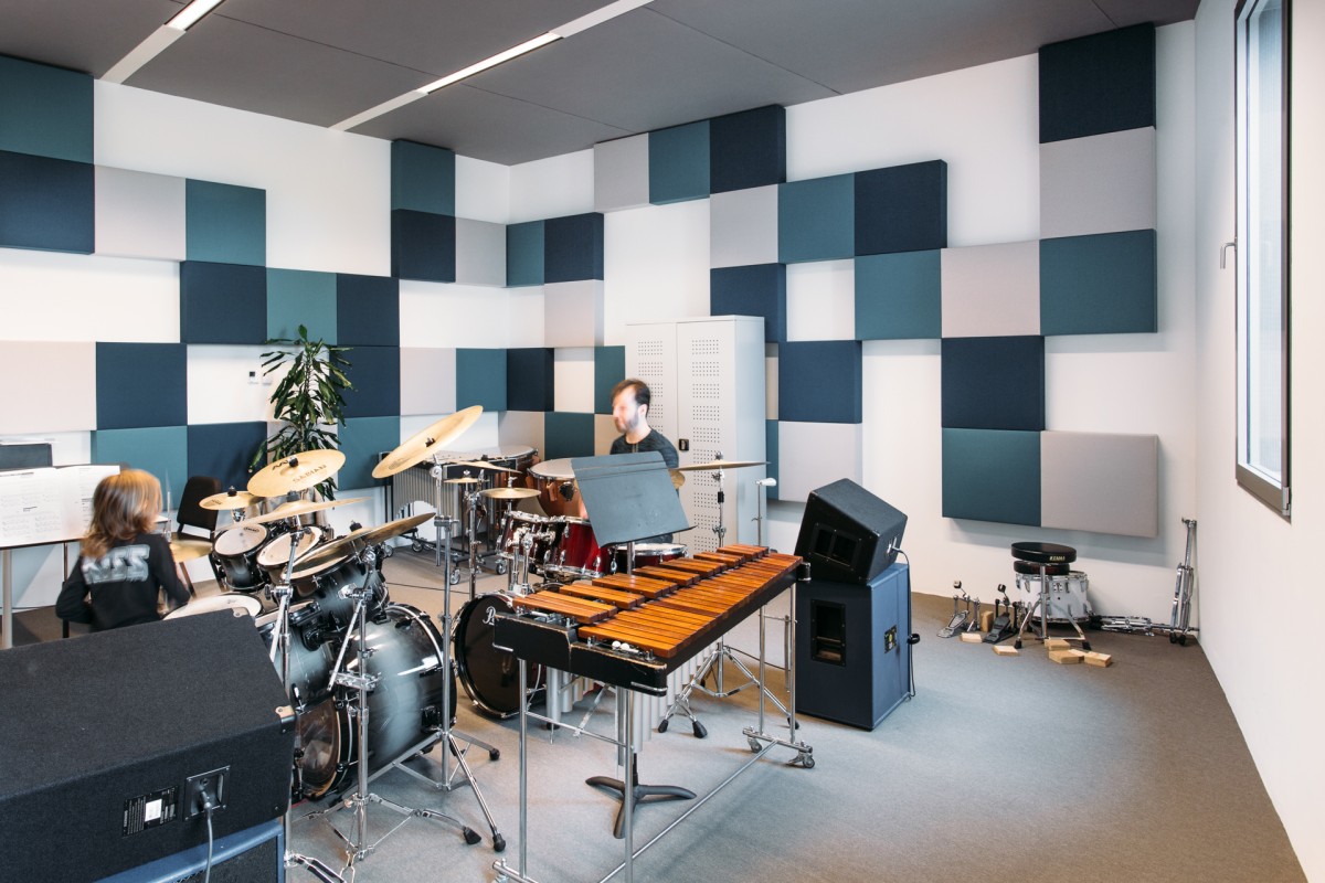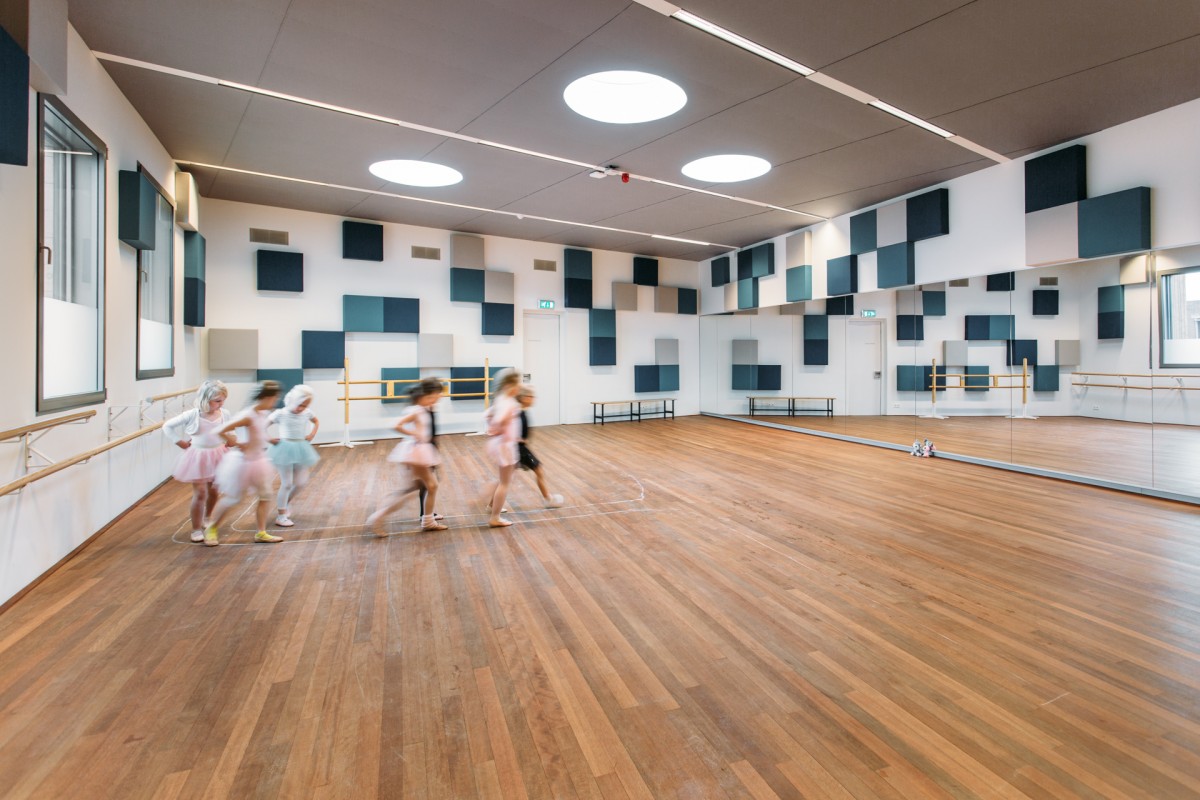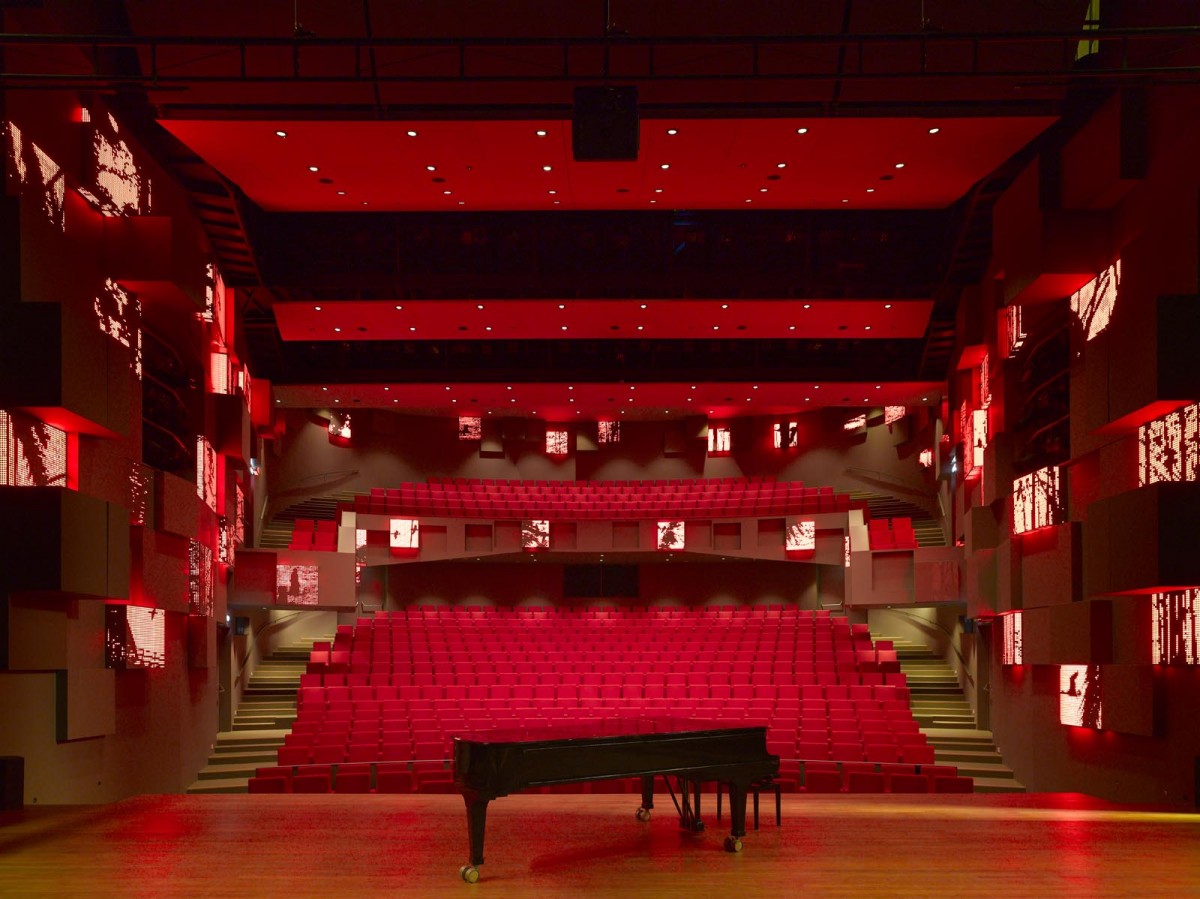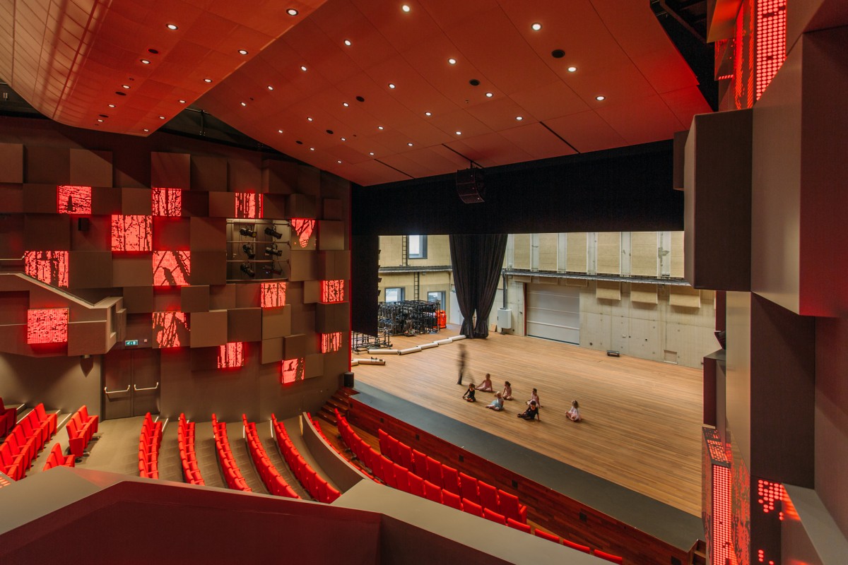Auditorium. The graphic sceneries colour featured on the acoustic elements adapts to the auditorium RGB ligting.