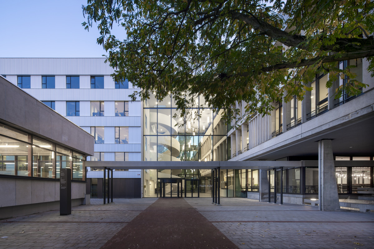 The architecture covers the renovation of an youn monument building from 1973, (designed by architect Ingwersen) plus a new extension. The new ensemble emphasizes the brutalistic character of the original building and at the same time expresses a contemporary and fresh look. With the inauguration of the renovated school, the liveliness of the surroundings has been revived.