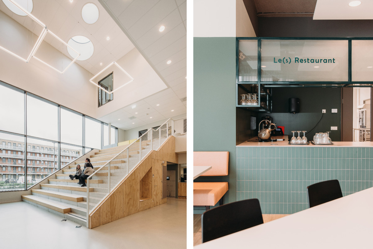 The school opens up to the neighbourhood and its residents - and this is a conscious choice: by showing what the VMBO has to offer to both students and society, we want to counter the image surrounding this type of school. On the ground floor there are practical classrooms, but also a teaching restaurant with a visible kitchen, and a 'training shop' for people from the neighbourhood, with the aim of showing- both visually and actually - what VMBO education entails.