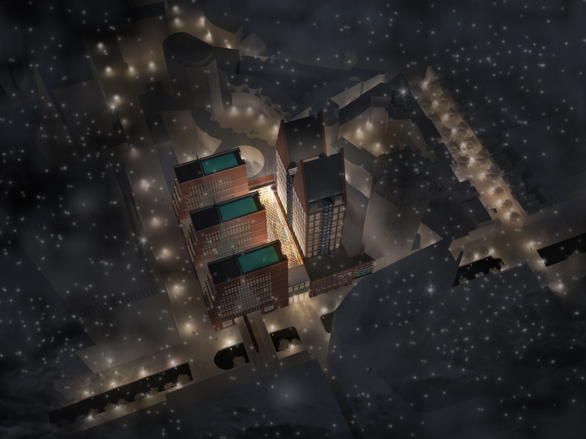 Voor ons stond vanaf het begin vast dat er kansen lagen om de schaal van het plein te transformeren in een meer beschutte en vriendelijke ontvangst en ontmoetingsruimte, waarbij de mens zich niet verloren zou voelen. Als aanknopingspunt vonden we de Gleditia’s, de bomen op het plein die nu een ijl bladerdak vormen, waarmee het plein meer geborgenheid krijgt. Wij hebben gekozen om het dak wat lager in de ruimte te hangen waardoor de smalle en lage ruimte vriendelijker proporties aanneemt. Het laagste punt van het dak markeert eveneens de receptie.