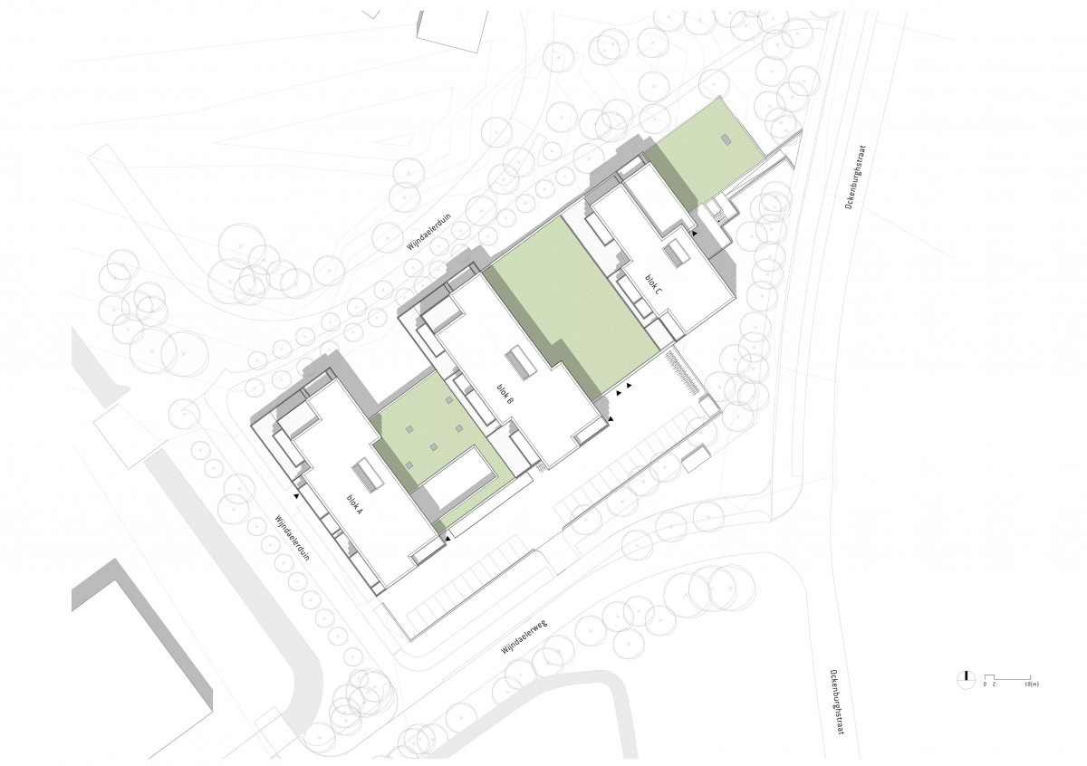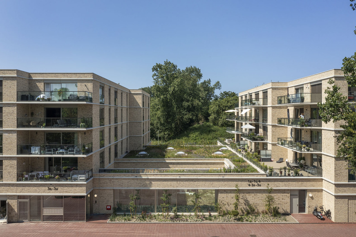The complex consists of 61 spacious owner-occupied and rental apartments, with a nursery and after-school-daycare on ground floor level. To preserve the open character of the area, we clustered the apartments in three separate residential blocks. The car park is kept out of sight, because it is  incorporated in an artificial dune, which also houses the main entrances, storage rooms and technical facilities of the residential blocks. On the Wijndaelerweg, the ‘dune’ has an urban character, with shop windows; towards the dunes, it is visually connected to the surrounding landscape by means of a green ‘slope’. The nursery and after-school-daycare both face the International School. The top of the 'dune' was designed as a green deck.