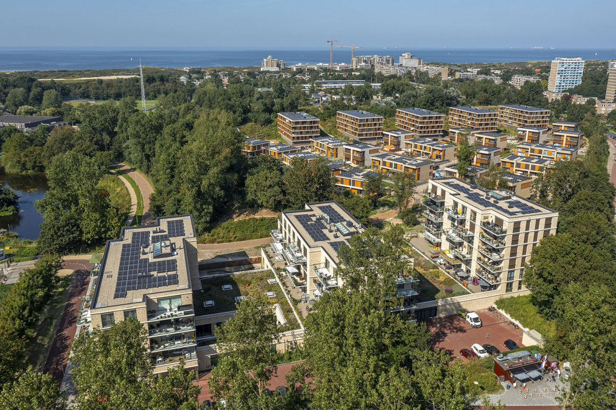 Our plan responds to the rich landscape which surrounds the complex: we used the existing height differences to hide the car park and extended the greenery of the dunes on the decks. All apartments are optimally oriented. Floor-to-ceiling façades make for comfortable living, together with generous outdoor spaces – divided between balconies, green gardens on the deck, and spacious roof terraces in the setbacks on the top floors.