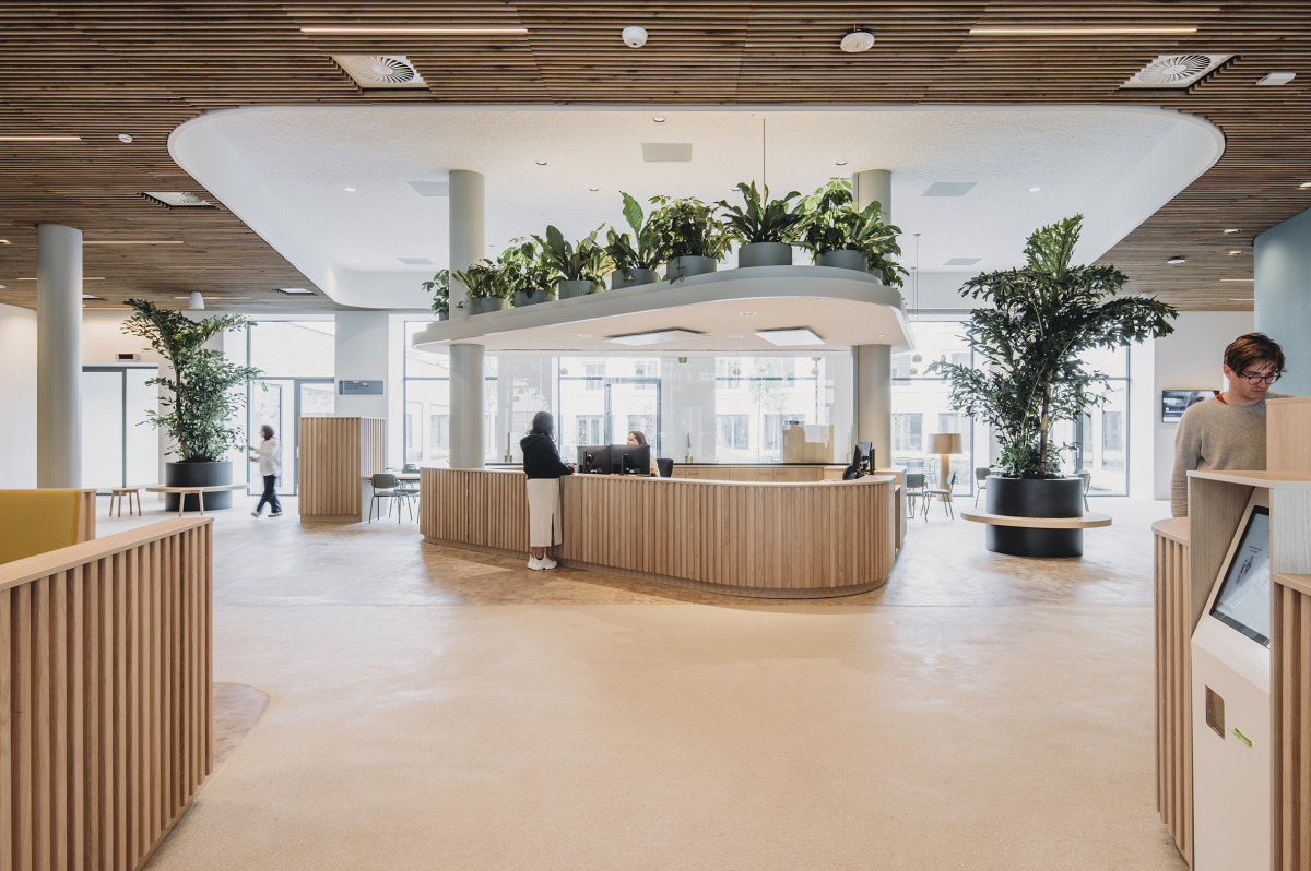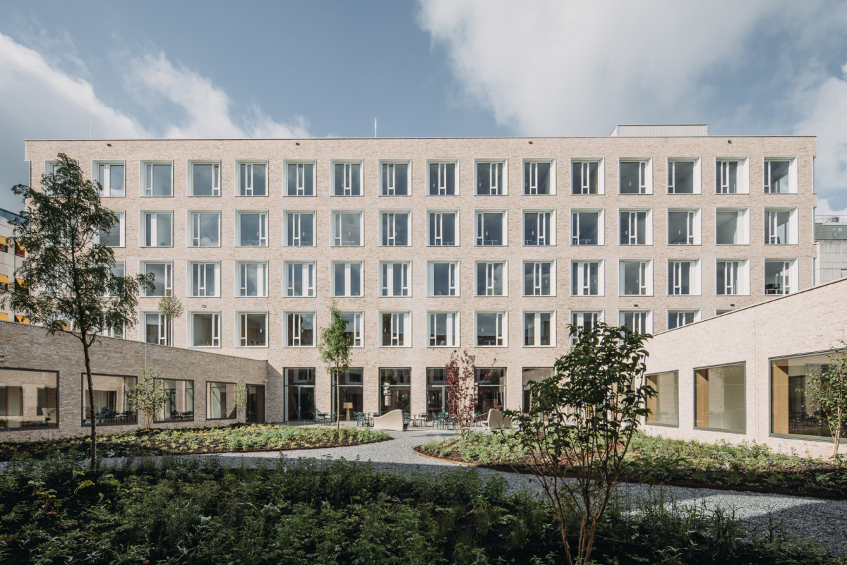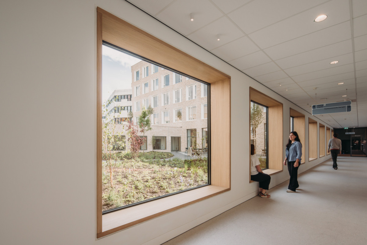 The green courtyard garden is visible throughout the building - not just from the grand café facing the garden, but also, for example, from the two cloister corridors connecting the polyclininc to the clinic. Seating niches can be found along both these corridors, offering pleasant, informal places to read or meet with visitors. The clinic faces the city - the canal with its coots, parents on their way to school with their children, everyday life. Thus, in-house patients – who are often in a vulnerable state - remain connected to the outside world, albeit in a safe and secluded way.