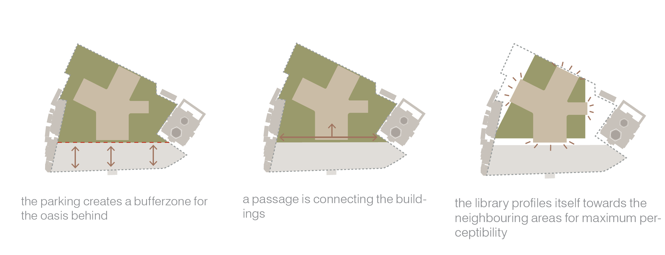 Just like a root, the existing Dar Al-Uloum building forms a point of departure from which the new extension spreads into the park, creating different smaller gardens more suited to the local climate and need of privacy. A transparent plinth of glass is formed all around the library, connecting old and new, outside and inside, and allowing views in all directions. The openness of the ground floor makes the ground level more suited for busy and public functions, while calmer and more private activities are taking place on the first floor.
