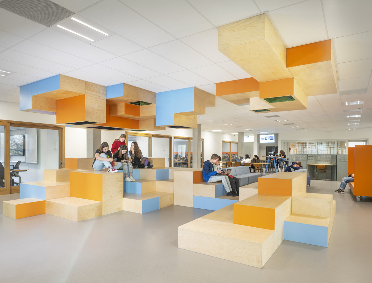 The educational vision is based on building a community. That is why the spaces had to be as transparent as possible, with as few blind spots as possible, but with cosy places where pupils can feel sheltered. This transparency even extends to the open spaces of the juniors’ section in and even into the open teachers’ spaces.