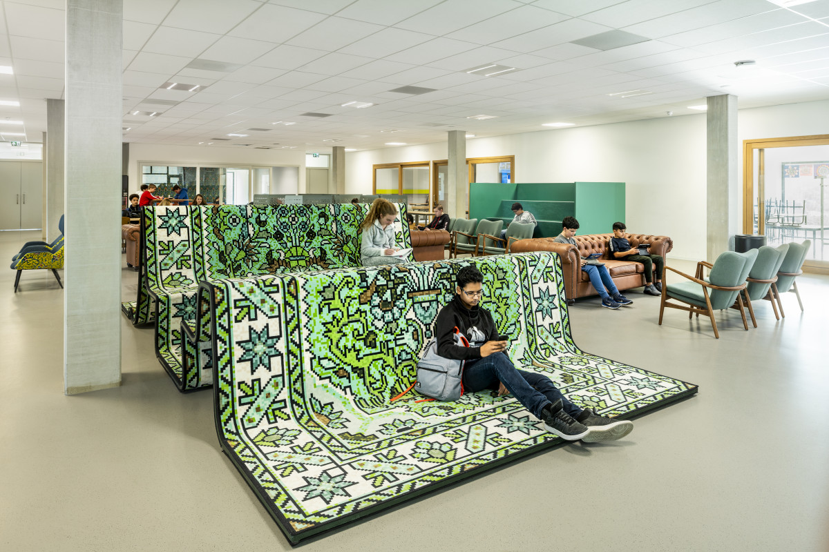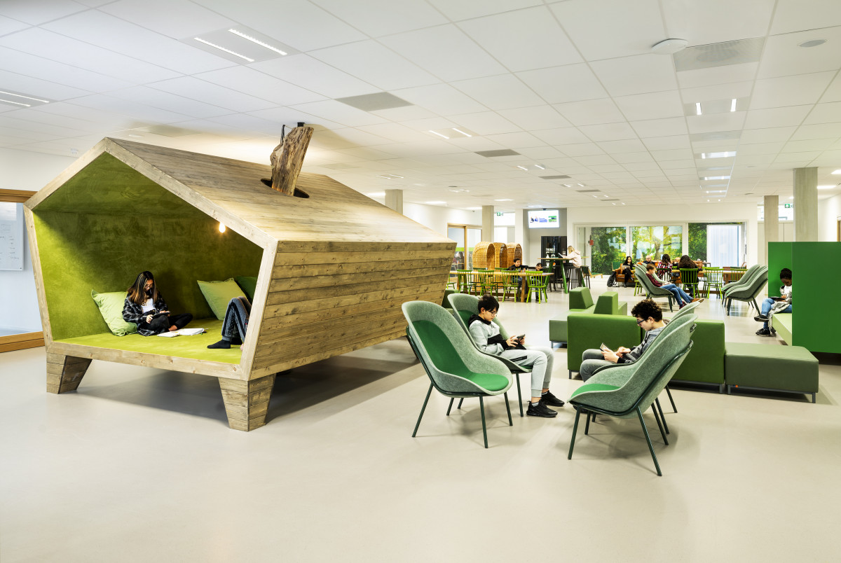 The concept for Lumion's interior design is based on supporting personalized learning and differentiated knowledge transfer. The concept distinguishes three learning settings such as 'campfires, caves and watering holes'. Campfires are settings where students gather around an expert who tells a fascinating story. Watering holes are spaces where students work together on projects and learn from each other. Caves are spaces where students retreat to study in a focused way.