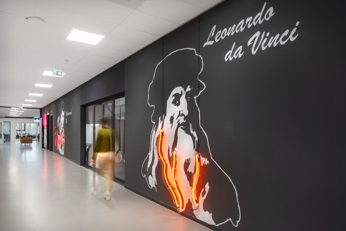 • Graphic neon illustrations of historical figures from science, culture and art on the walls