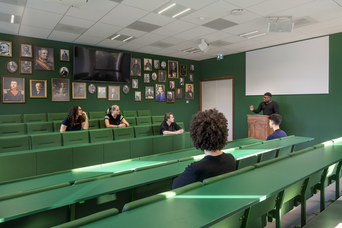 The renovated building section is the domain of the senior students. The clogged closed corridors have been broken through, creating many open spaces. The spaces help the students to prepare for higher education. You follow sessions instead of attending lessons. There are wonder rooms, such as a debating room (green House of Commons), but also a Space Odyssey-like lecture hall with a sleek design or a room with a stage for TED talks. It is the students' perception of the teacher that determines which space is used. In this way, students can take in the material in different ways... passionately debate, be amazed and inspired.