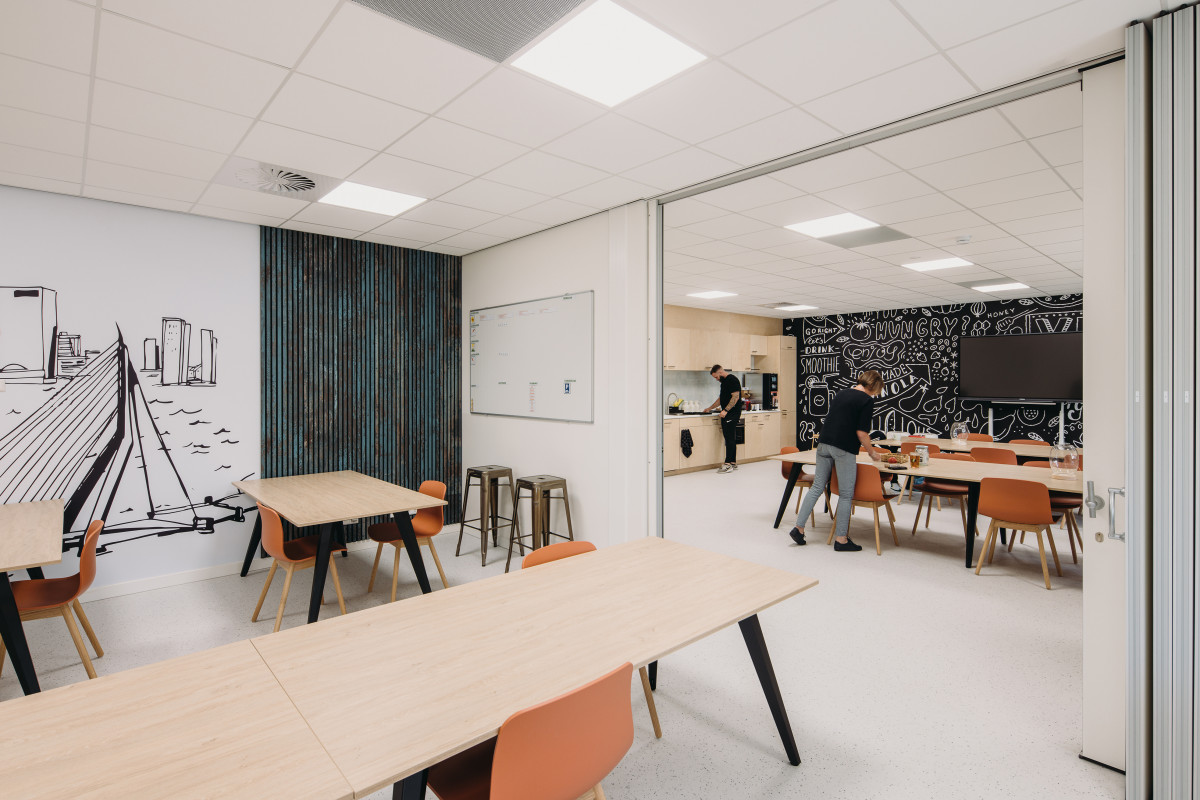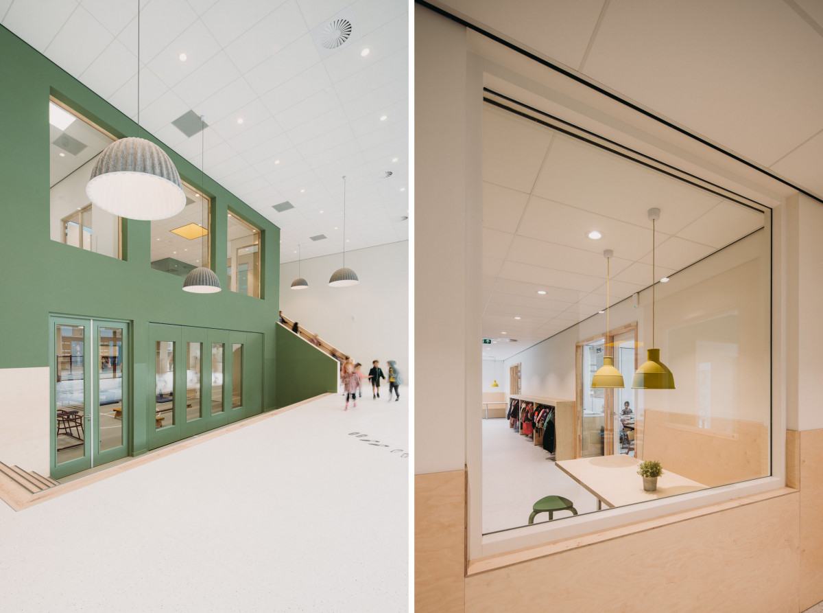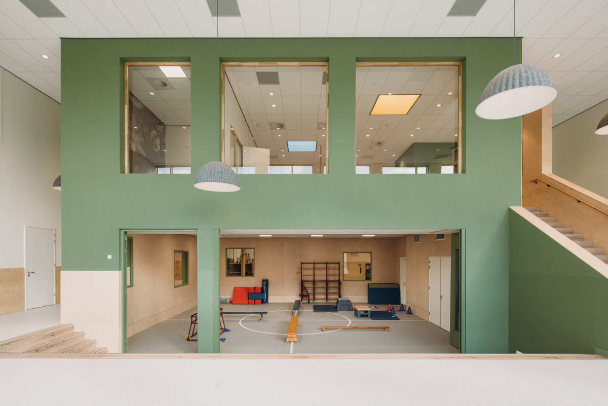 The new building has a clear L-shaped floor plan, in line with the modernist urban planning of post-war neighbourhood Overschie. The ensemble’s clever positioning results in the natural organisation of the three school playgrounds: a green nursery playground facing the Baanweg, where children can discover nature; a secluded playground for the middle school in between the two buildings, where the pupils can clamber and climb; and an upper school yard that connects to the Sidelingepark, with space to run, play football and chill. This layout is in keeping with the different school entrances, and ensures that the lines to and from the classrooms are kept short. The scale of the child is guiding on all the different levels of the building, both inside and out.