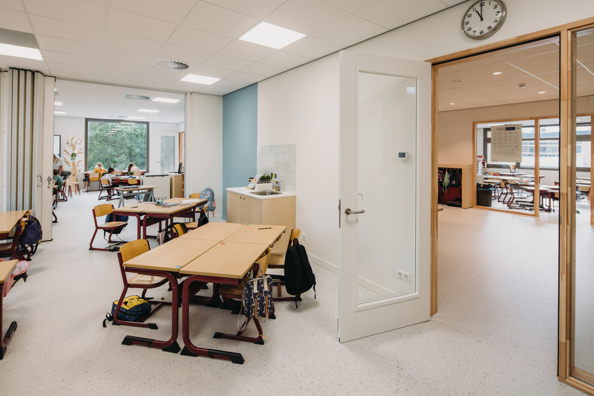 The classrooms are arranged in clusters which surround the assembly hall. To provide the children with a sense of belonging, each cluster consists of three to four classrooms, centred on a learning plaza and a utility hub. Large windows - which mirror the windows of the Zongebouw - ensure that there is easy contact between the classrooms and the learning plazas. By applying flexible partition walls, the classrooms can be interconnected. Each cluster has its own entrance to the assembly hall and direct access to the schoolyard.