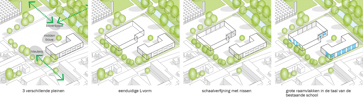 The Albert Schweizer School is located in Rotterdam Overschie, directly adjacent to the Sidelingepark. The elementary school was housed in three buildings from the 1970s, with the pupils deliberately divided according to age group between the three. The existing school, however, did not have a central assembly hall; also, an expected rise in the number of pupils meant there was not enough room in the future. The new volume replaces two outdated buildings, and forms an ensemble with the remaining ’Zongebouw’ (Sun Building). Because the design builds on the existing architecture and educational philosophy, the sense of scale and of belonging have been retained.