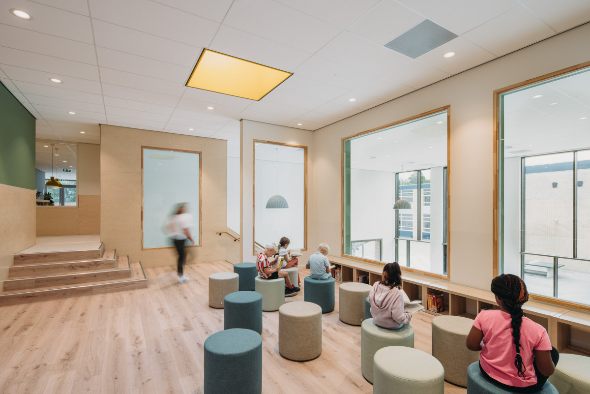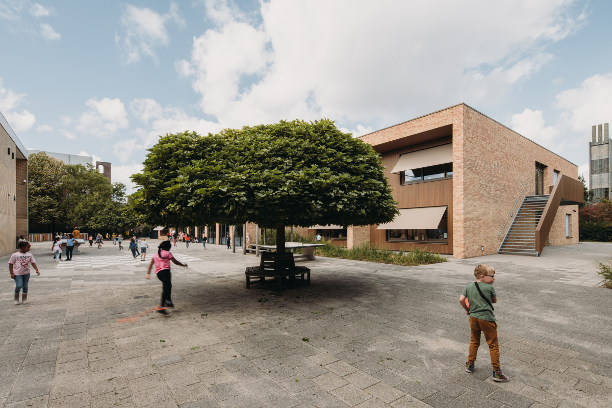 The Albert Schweizer School lacked a ‘heart’. That's why atelier PRO - in collaboration with Studio LP - designed a new building for this Rotterdam elementary school, with an assembly hall as its central feature. The new L-shaped volume embraces an existing school building from the 1970s, and is positioned so that the assembly hall also serves as the heart of the older building. The classrooms are arranged in clusters surrounding the assembly hall; each cluster has a learning plaza as a heart of its own. The design concept scales from large to small: the assembly hall serves as an identity carrier for the school as a whole, whereas within the clusters the users - in this case the smallest children - take center stage.