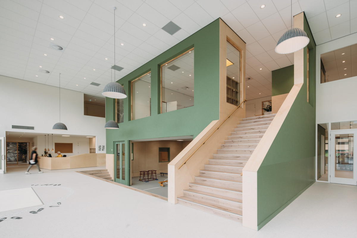 The new building is the preserve of toddlers, preschoolers and the lower school. It also houses a number of shared facilities like a playroom, a library, a team room and the assembly hall. The assembly hall serves as the heart of the new building - and, due to its location and transparent layout, also for the school as a whole. The hall is extended with a sunken playroom, which makes it possible to create a large, connected space for theatre performances and parent meetings. Located above the playroom is the student library, which is also slightly lower in relation to the surrounding first floor, and as such is ideal for informal meetings.