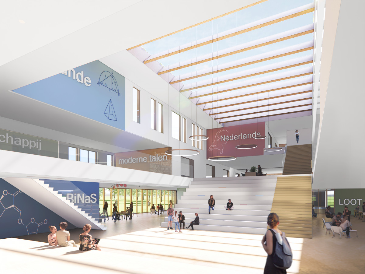 The assignment is the realization of an educational building for 1,530 students of Sint Joris College and 190 students of Helder havo/vwo. This translates into a space requirement of 11,300 m² gross floor area (GFA) for education and 2,200 m² gyms, in total 13,500 m² GFA. The new building will be behind the current location of the Sint Joris College on the Eikenburg estate. Two schools, each with its own character and target group in one building, requires a smart main set-up. The schools have their own outdoor space with their own entrance. Outside you can hardly see the other school, while in the building the spaces used by both schools are centrally located.