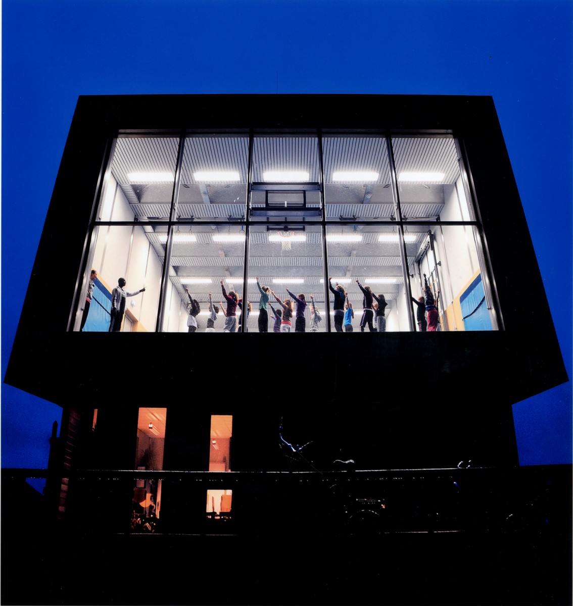 By placing the main hall and the play area in the middle of the building, these areas have literally and metaphorically become the heart of the organisation. Here the link between the ground floor, the crèche, with the gym above and the visual and spatial contact between the classrooms, is distributed over three floors in a spatially interesting and dynamic way. At this point the building is largely transparent, affording a view into the park. The primary school is designed in such a way that each group – lower, intermediate and upper – has its own floor. The lower has four classrooms on the ground floor, the intermediate has six on the first floor, and the upper has four on the second floor. Each group has its own entrance to prevent the youngest children from being over-shadowed by the older ones. Each group entrance provides access to its own playground; the playgrounds are connected with each other and are draped like a tablecloth around the school. The classrooms of the school are north-facing. On the south side, facing the park, is a broad multifunctional space of which the corridor forms a part. This is a light and open space that affords a view into the Park.