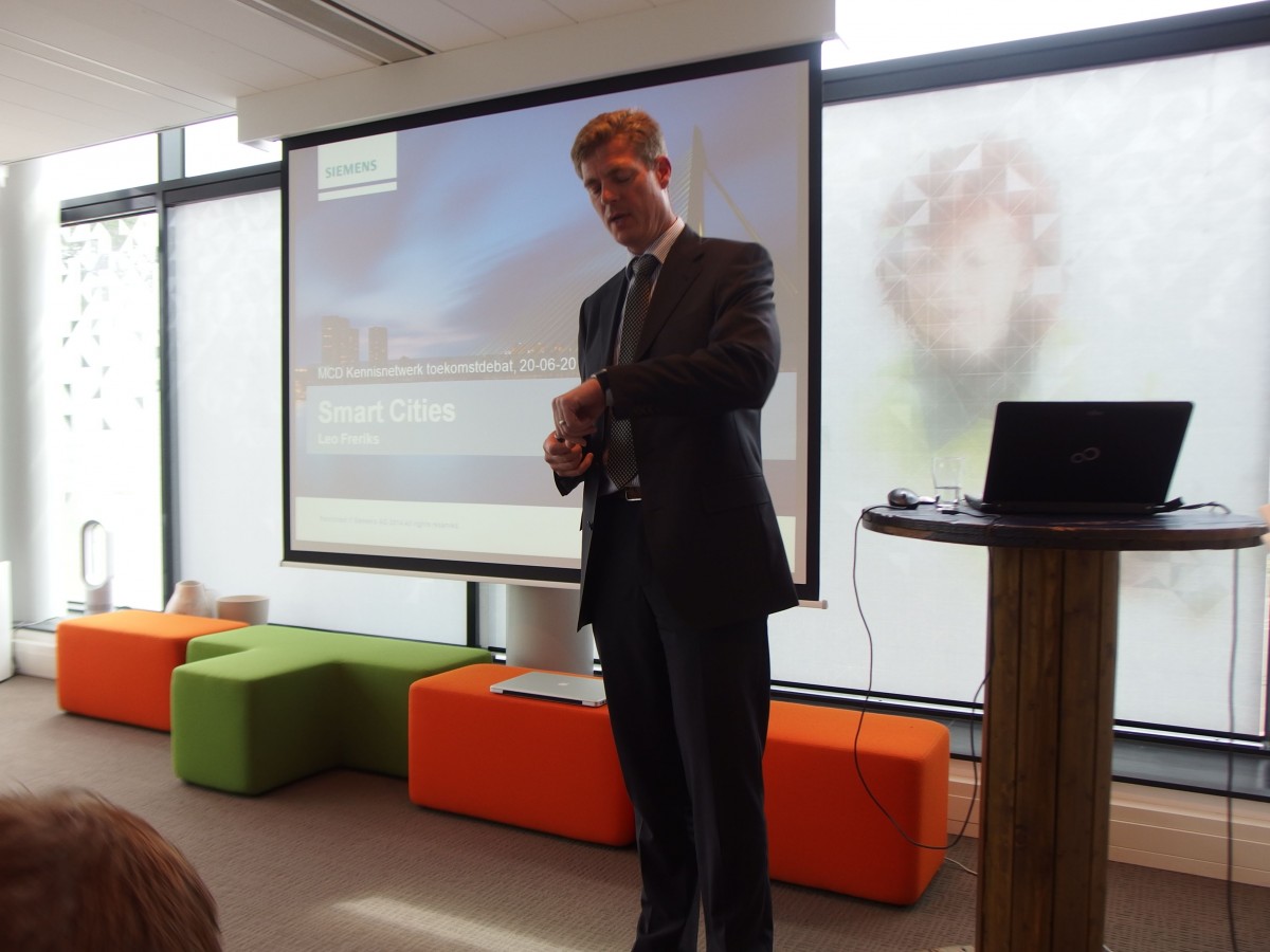 Siemens levert slimme technologieën waaronder de componenten van het smart grid van Enexis. Leo Freriks laat namens Siemens een film zien waarbij de toekomst van de stad wordt geschetst:  Dit vooral vanuit technologisch perspectief verbeeld. Siemens richt zich als bedrijf niet zozeer op IT maar meer op de onderliggende systemen: transportsystemen zoals rail of implementatie van traffic control, smart grids en windenergie, veiligheid en sensoren. In Londen opende Siemens The Crystal, een centrum waar de duurzame  stedelijke ontwikkeling wordt getoond. De ‘Green City Index’ is een nieuwe stap in het promoten van ‘smart cities’. Amsterdam behoort in Europa bij de eerste vijf steden op de ‘Green City Index’.  Als partij ziet Siemens zich vooral als ‘stakeholder’ in het rendabel maken van ‘business case cities’.