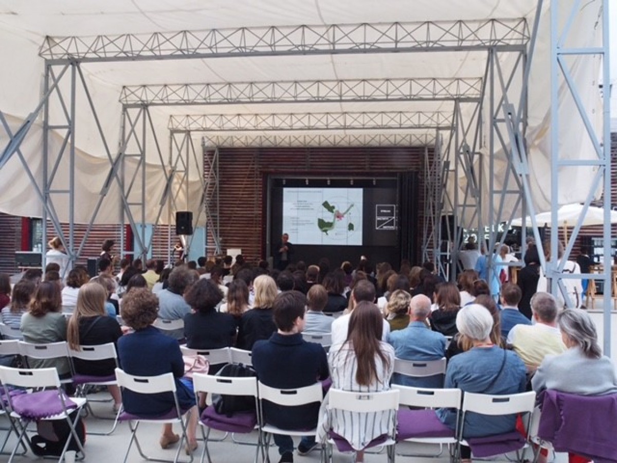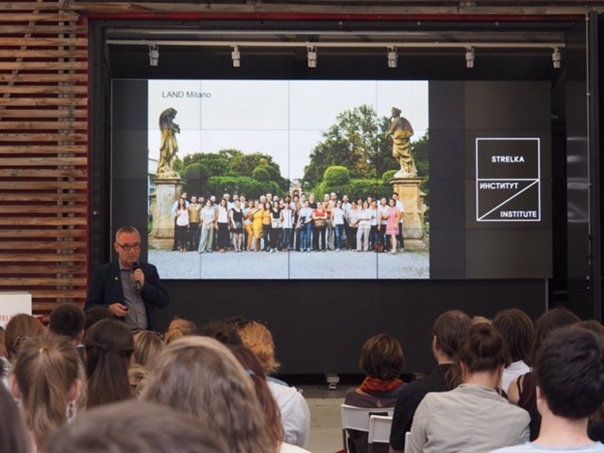 's Avonds is er een lezing van Andreas Kipar over landschap en urban planning in het openlucht theater van Strelka. Nu vind ik gebouwen bijzonder maar landschap staat bij mij bovenaan de lijst. Voor Andreas echt met zijn verhaal begint, stelt hij zich eerst voor. Maar daarna noemt hij ook een hele reeks namen als een greep uit zijn bureau. Met een groepsfoto op de achtergrond legt hij uit dat hij wel het verhaal houdt, maar natuurlijk niet zonder zijn ‘Luigi, Nadia, Claudio, Kaspar’ etc. kan. Wel een sympathiek gebaar vind ik.