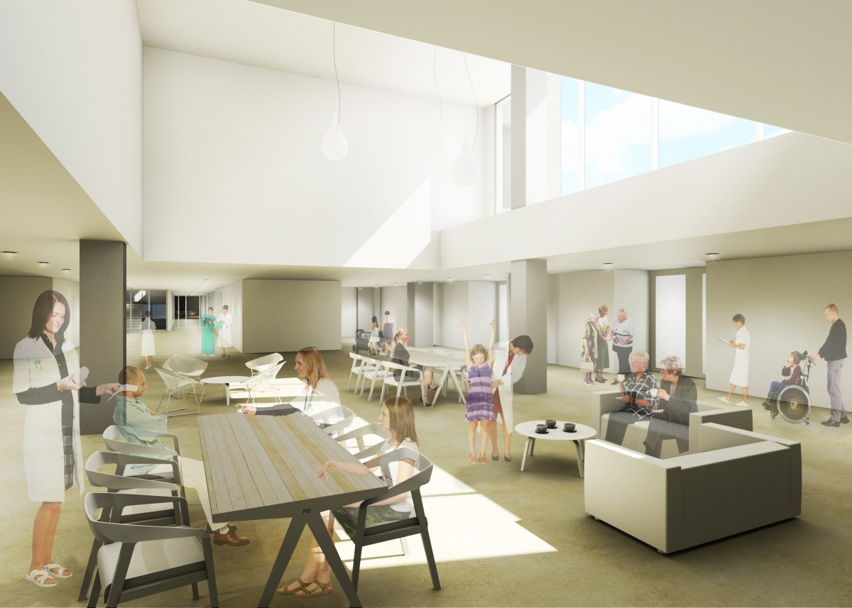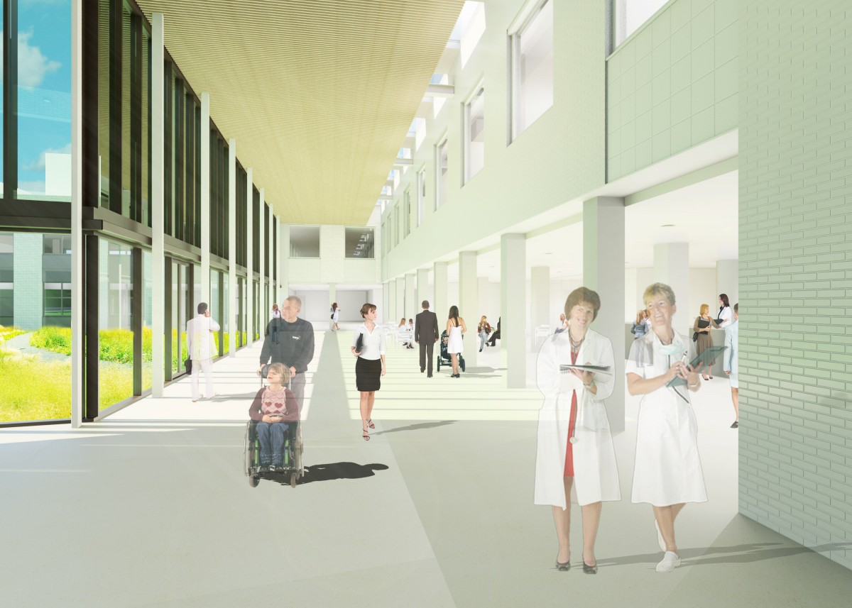 De grote glasoppervlakken zorgen voor veel daglicht, zelfs tot midden in de vernieuwde beddenafdeling. De nieuwe tuin in de huidige patio geeft niet alleen een prettige sfeer, maar speelt ook een rol bij de oriëntatie binnen. Vanaf de centrale ontmoetingsplek zijn voor zowel de patiënten als de bezoekers alle afdelingen op een eenvoudige en prettige manier te bereiken.