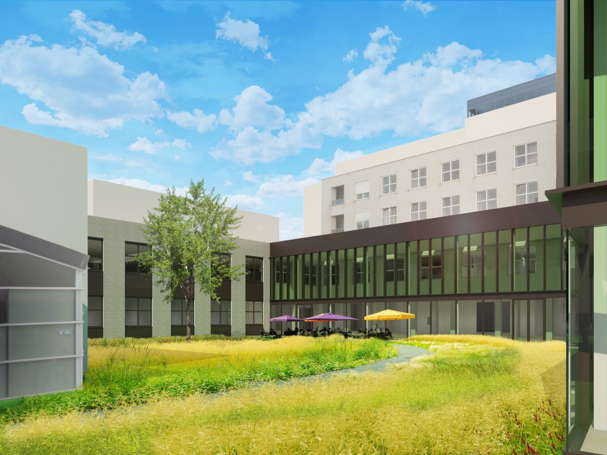 De tuin vormt de groene toegang tot het vernieuwde ziekenhuis en het bestaande radiotherapeutische centrum ZRTI.