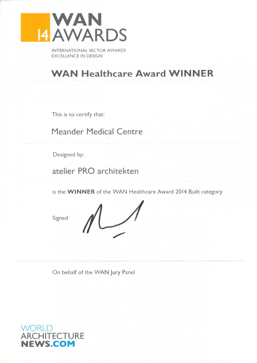 Reeds in 2014 won atelier PRO architekten met het ontwerp van Meander Medisch Centrum de prestigieuze World Architecture News (WAN) Healthcare Award in de Built categorie.