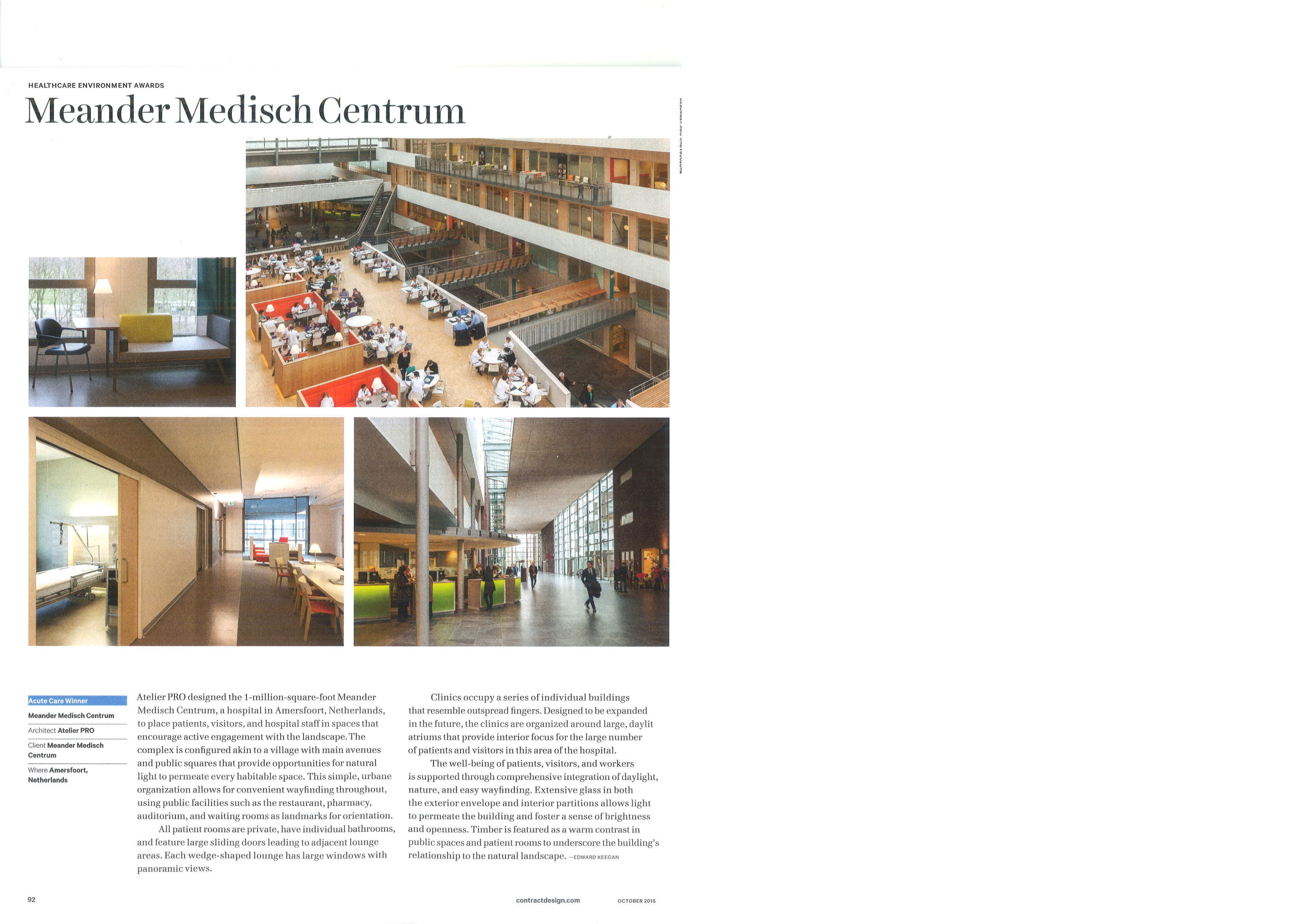 De Healthcare Environment Award is een initiatief van Contract Magazine en het Amerikaanse Center for Health Design. De prijs erkent innovatieve interieurontwerpen in de zorgsector. Atelier PRO werd met het ontwerp van Meander winnaar in de categorie Acute Care. De uitreiking van de Healthcare Environment awards vond op 16 november plaats tijdens de 3-daagse Healthcare Design Conference in Washington.