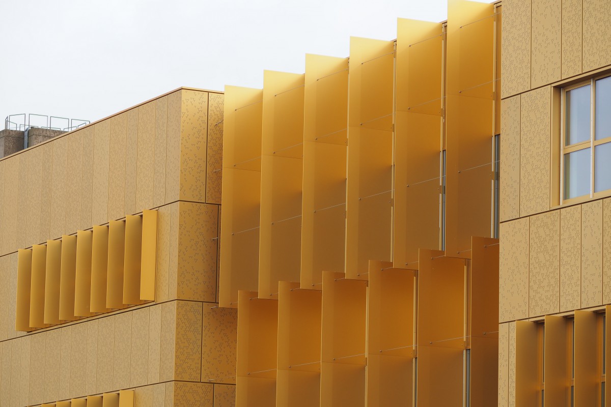 IJburg College is wat je noemt helemaal van god los. Er is geen gang en eigenlijk zijn er ook nauwelijks lokalen. Welbeschouwd is het een bedrijfshalconstructie met een trappenhuis in het midden en vluchttrappen op de koppen met een aluminium gevel er om heen. En wat me als stadsfietser enorm deugd doet; een hele mooie fietsenstalling half verdiept onder het gebouw voor de scholieren. Hier kom je dus niet struikelend over fietsen aan bij je school. En je zadel is ook nog eens droog als het regent, wat een luxe. Dat is toch wel heel mooi van de gemeente Amsterdam dat ze daar geld voor vrij maken.