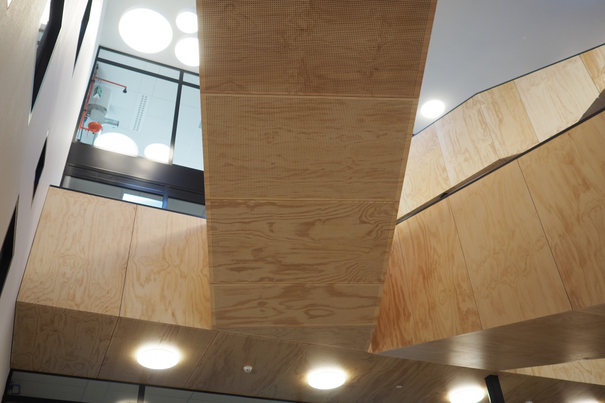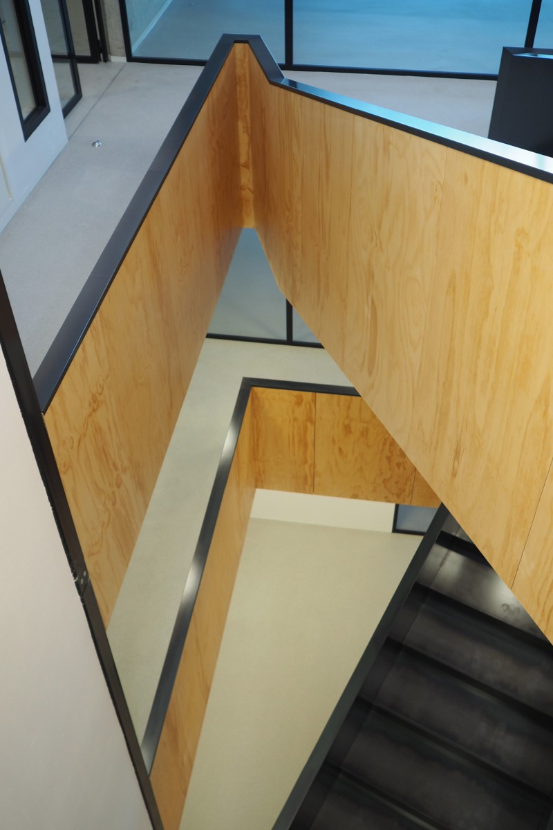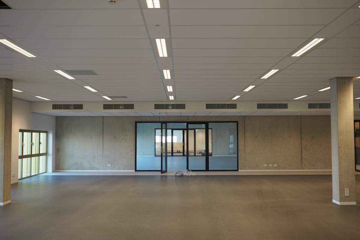 Het trappenhuis is een plek waar we even flink in de bus geblazen hebben en dat kan omdat er verder nauwelijks een inbouwpakket is. Die trap zat er in de prijsvraag al in en hij heeft alle optimalisaties overleeft. Niet te fotograferen maar hopelijk geeft het filmpje enig idee. En als je geluk hebt kom je terecht in het lokaal in de hoek, met uitzicht op het water en het riet- en weidelandschap van Noord-Holland. Als ik daar zou zitten zou ik me nooit vervelen maar of dat dan weer 'personalised learing' is weet ik niet zeker.