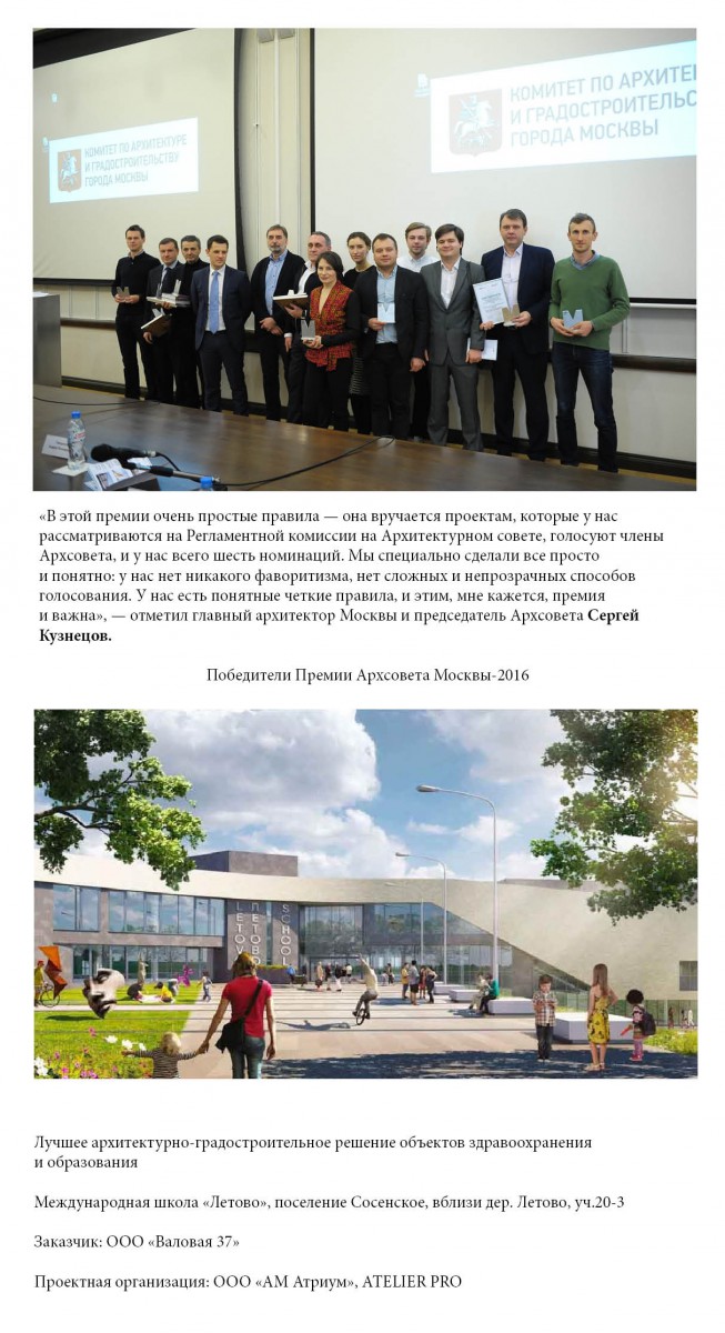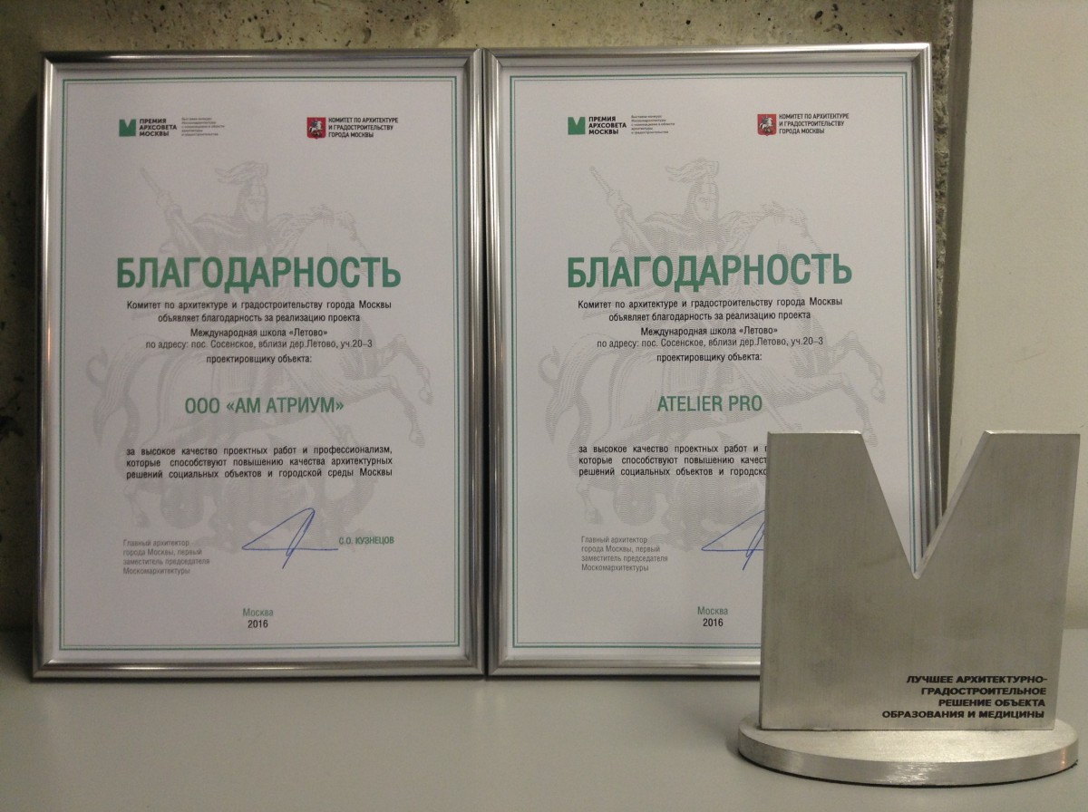 Atelier PRO heeft van de stad Moskou een architectuuronderscheiding gewonnen voor beste ontwerp in de categorie Onderwijs. Dat is op woensdag 21 december 2016 bekend gemaakt door Sergey Kuznetsov, voorzitter van de Commissie voor Architectuur en Stedenbouw van de stad Moskou.