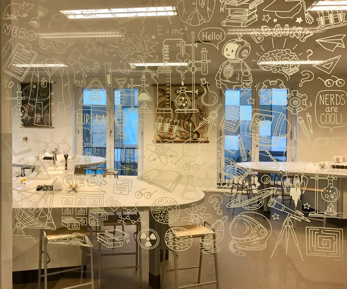 De bèta vleugel is voorzien van glas met prints. Dit zorgt voor privacy tijdens lessen in de lokalen. Aan het patroon van de glasprints herken je welk vak er gegeven wordt. Ook zijn er aan de bèta vleugel twee leerpleinen toegevoegd. Aan de vloeruitsnedes in het marmoleum herken je welke vakken in dit deel gegeven worden. Oud en nieuw zijn met elkaar verbonden: ledspots belichten de objecten in de vitrinekasten met rijksmuseumblauw interieur.