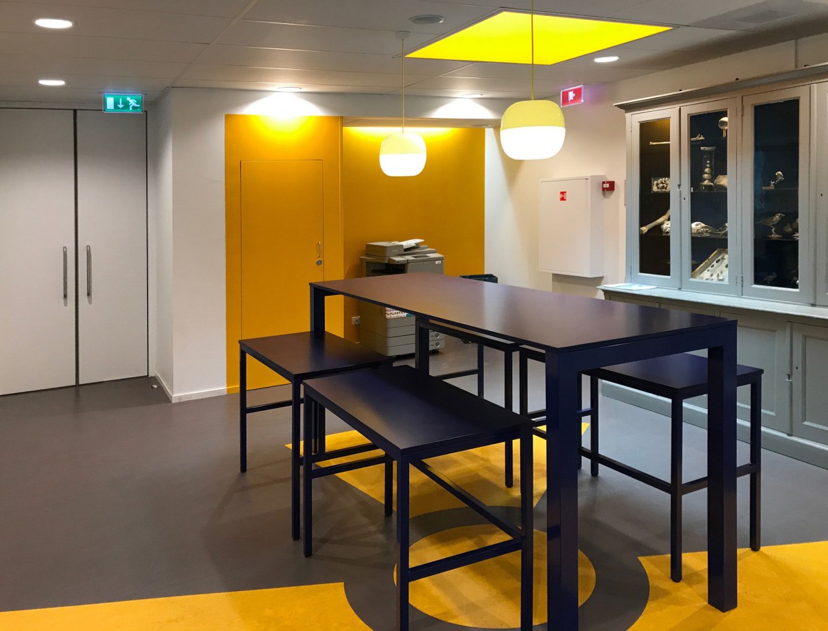 Tweeduizend leerlingen is een grote gebruikersgroep en betekent intensief gebruik. Als bureau hebben wij in principe een nazorgafspraak met Onderwijspark Ezinge. Inmiddels hebben we eerder de aula geoptimaliseerd en later bestond behoefte aan nog meer zitruimte. We hebben meer tafels neergezet met een stoer uiterlijk en krukken van staal. Ook zijn er banken van blauwstaal toegevoegd. Die hebben een materiaaldikte van 1 centimeter. Het staal gaat door een oliebad en krijgt daardoor een stoere blauwe zweem. De olie dringt tot diep in de kern. Zo’n solide meubel kan tegen een stootje, is krasbestendig en is van hoge duurzaamheid.