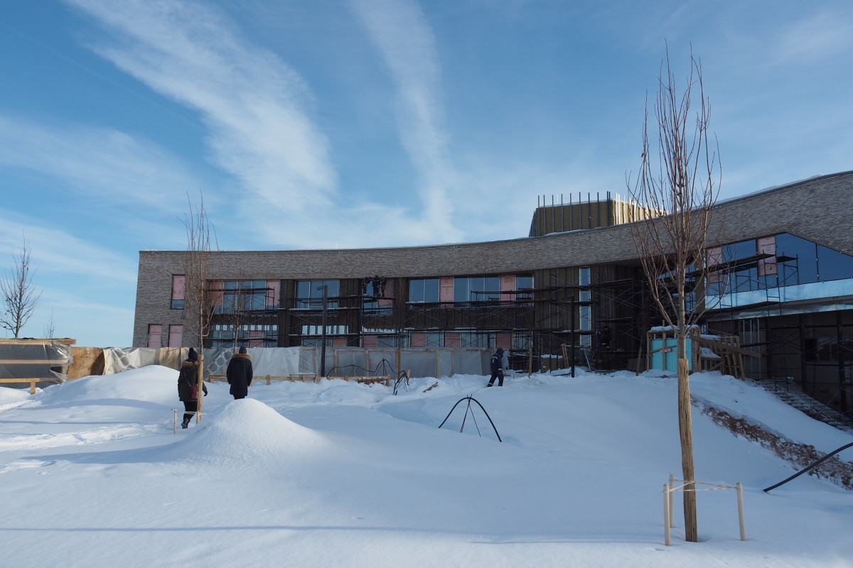 We boffen enorm met het weer. Het is koud maar we hebben een strak blauwe hemel en dus veel zon. Er licht een flink pak verse sneeuw zodat het lijkt of het landschap al klaar is. De bomen zijn zelfs al gedeeltelijk geplant zodat ze, als het voorjaar begint, direct aan kunnen slaan. Er is nu wel een grotere weg aangelegd. Desondanks is de weg waar de school aan ligt een rustige ventweg, het voelt daardoor nog steeds landelijk aan.