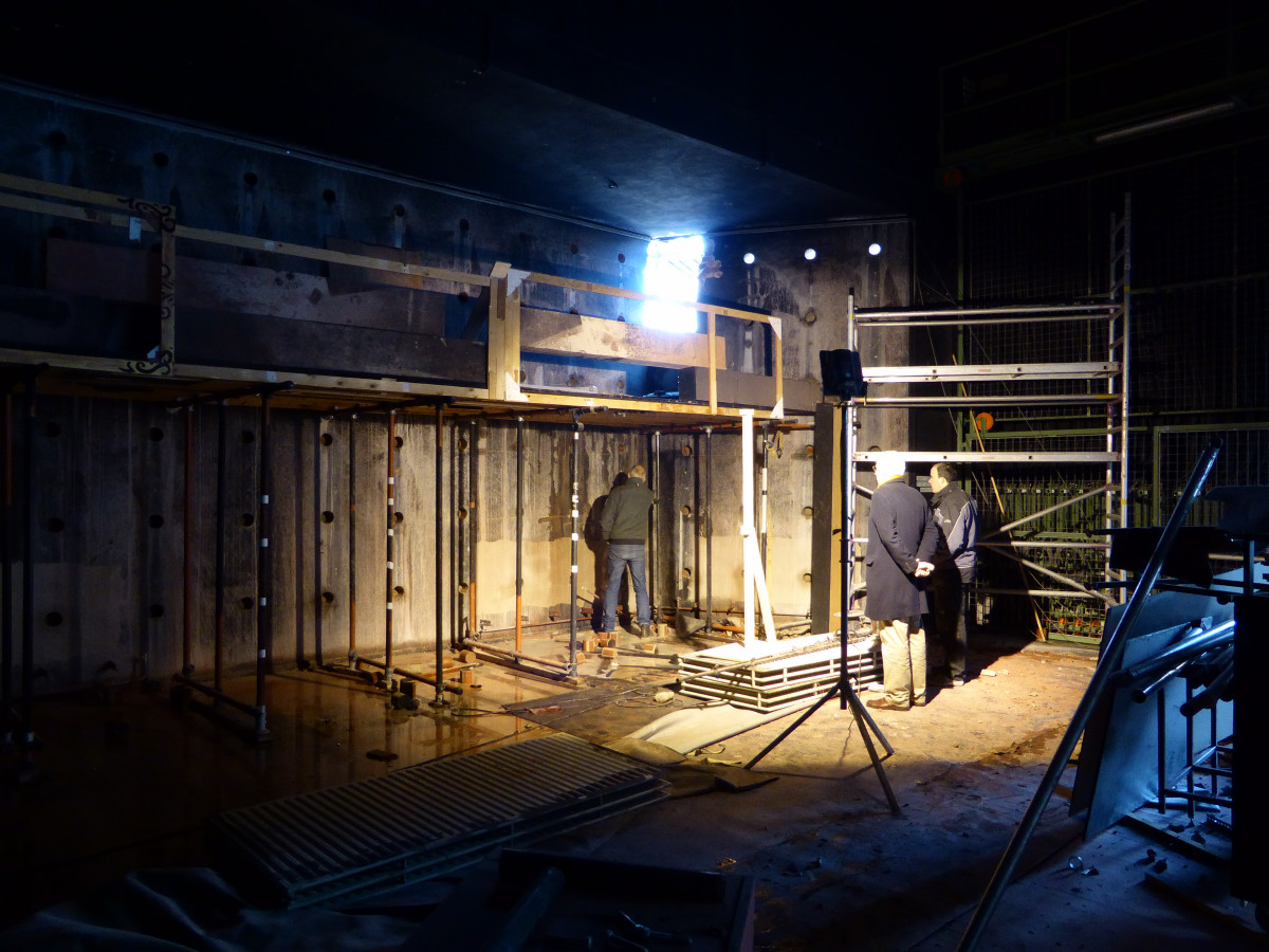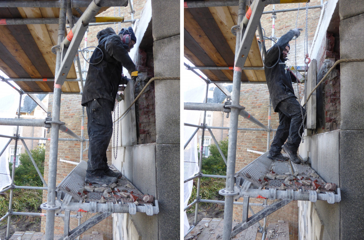 Voordat de sloper echt los kan gaan, moest dat nog ‘even’ van de gevel gehaald. Of liever gezegd uit de gevel. Het kunstwerk bestaat uit tegels van schokbeton die op iedere hoek verankerd zijn in de achterliggende wand en met hele goede lijm/specie zijn vastgeplakt. Een flinke klus om ze, zonder beschadigen, van de gevel te halen. Steenhouwerij Maarssen is een gespecialiseerd bedrijf dat de tegels van de gevels haalt, ze schoon stoomt, opslaat en uiteindelijk in de nieuwbouw weer in de nieuwbouw terug gaat plaatsten. Handle with care!