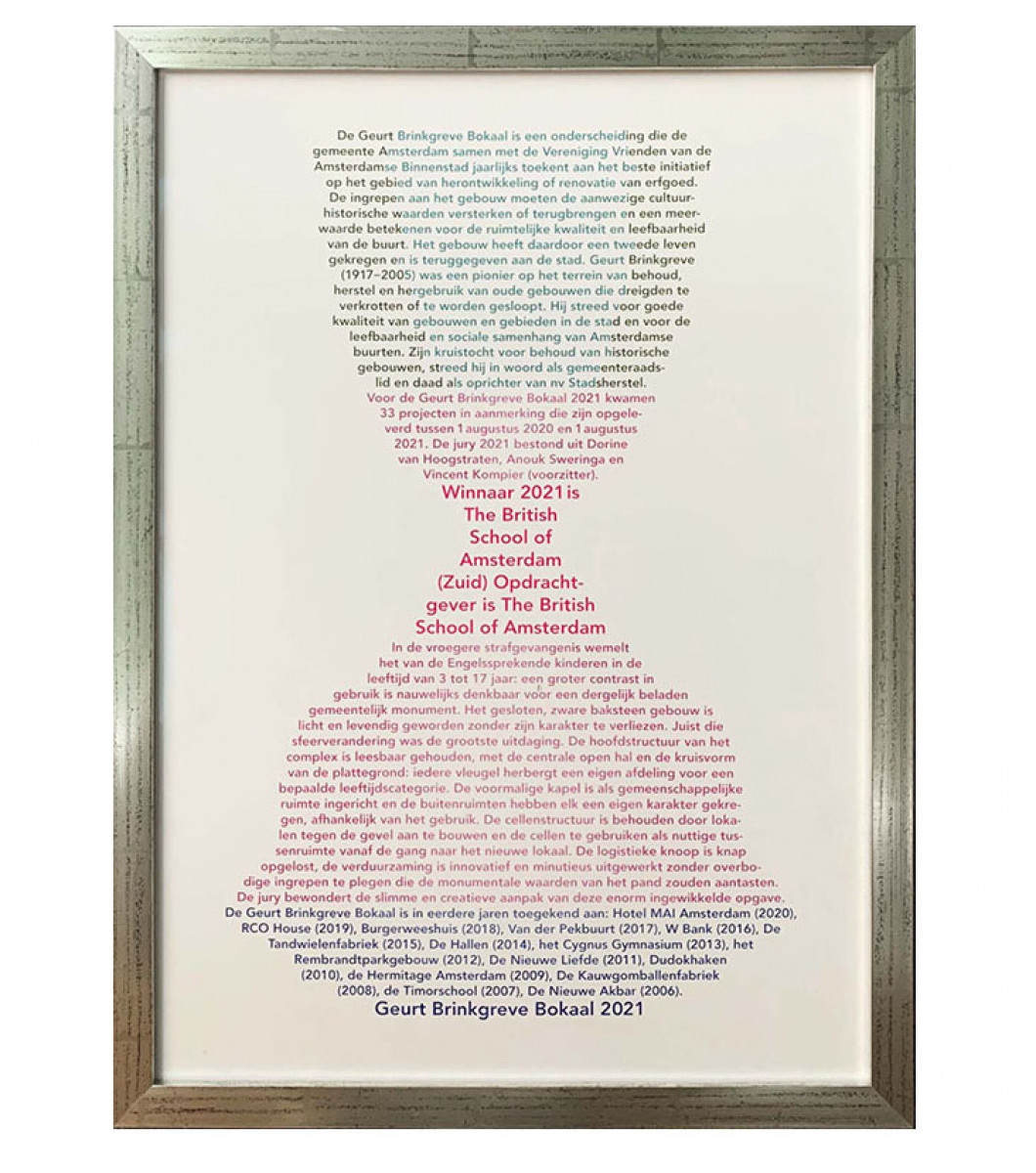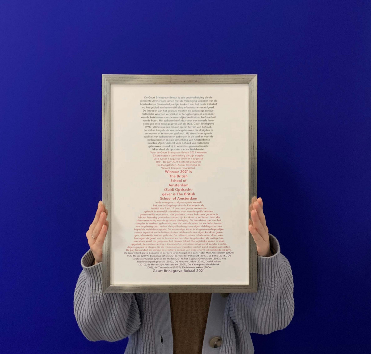 Tijdens een uitzending van AT5 overhandigde Marieke van Doornick, wethouder Ruimtelijke Ordening en Duurzaamheid van Amsterdam afgelopen woensdag de Geurt Brinkgreve Bokaal aan Paul Morgan en Bas van Haver van The British School of Amsterdam. Een prijs met een boodschap. Waardering voor de transformatie van een gevangenis naar een school. Waardering voor de ambitie van de school. Waardering ook voor het subtiele samenspel van oud en nieuw.