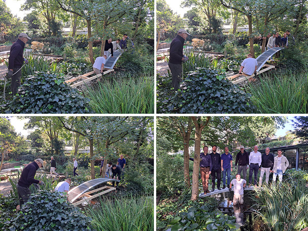 Ons kantoor ligt midden in een prachtige wilde tuin, die niet alleen wordt gebruikt door het team van Atelier PRO, maar ook door zeldzame kikkers en salamanders. Om ervoor te zorgen dat deze beschermde diersoorten een goed ‘thuis’ bij ons hebben, hebben we een nieuwe brug over de vijver geïnstalleerd - niet alleen omdat het mooi is, maar ook om het water vrij te houden van kroos en onkruid.