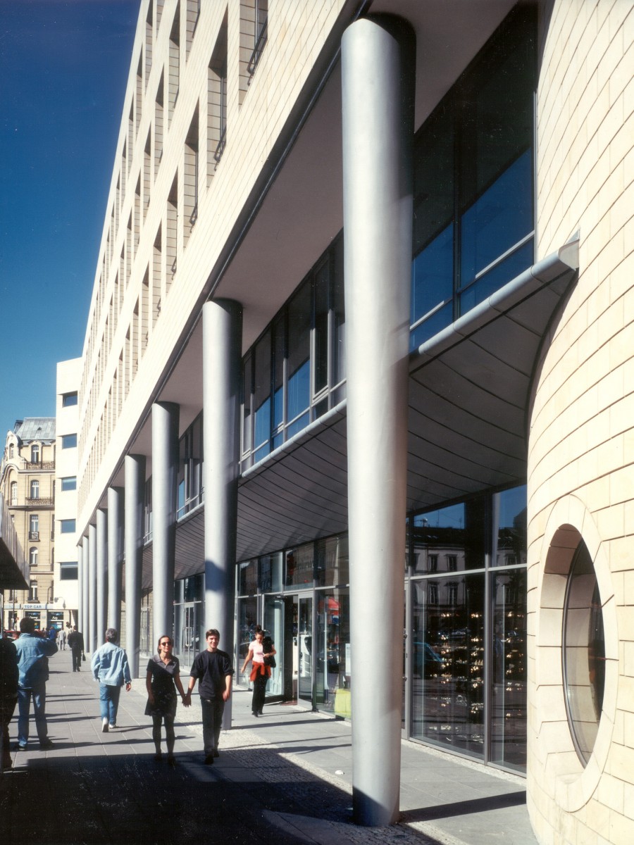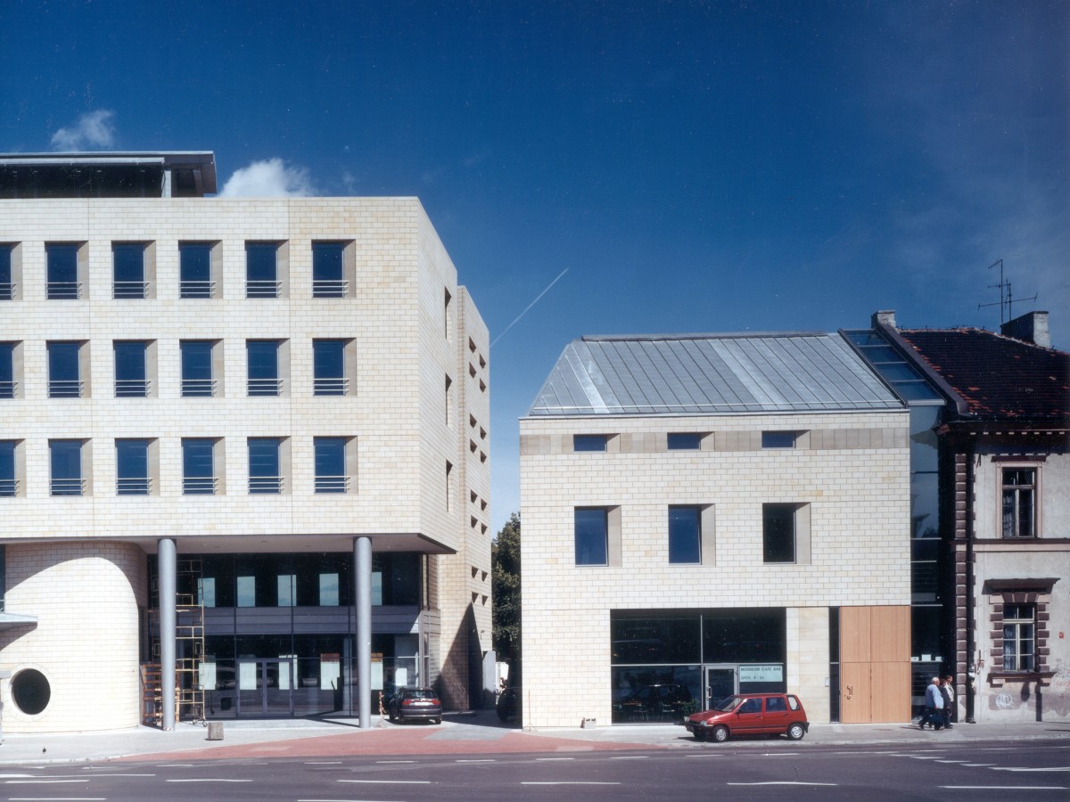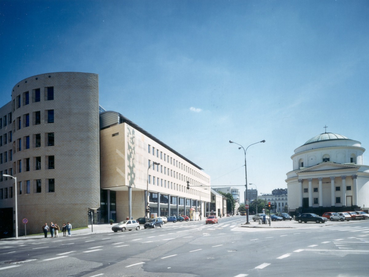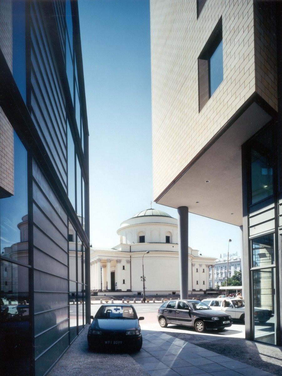 Het kantoorgebouw naar ontwerp van atelier PRO biedt de oplossing voor de in de oorlog zwaar gehavende oostwand van het Driekruizenplein in Warschau. Tegelijk geeft het vorm aan de hoek met de Ksiazecastraat en de aansluiting op het uitgestrekte parkgebied langs de Vistula Rivier.