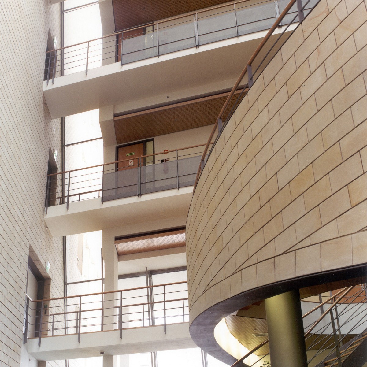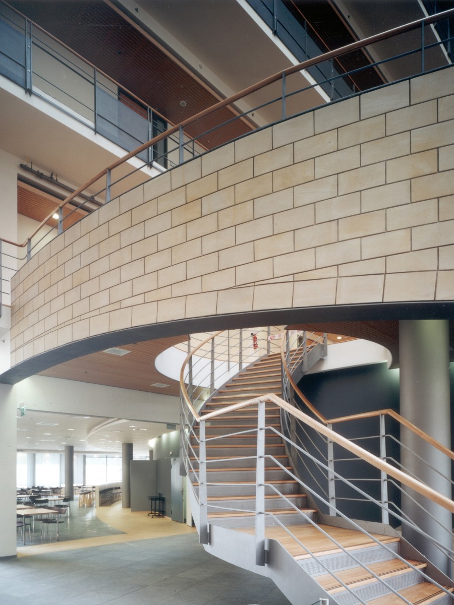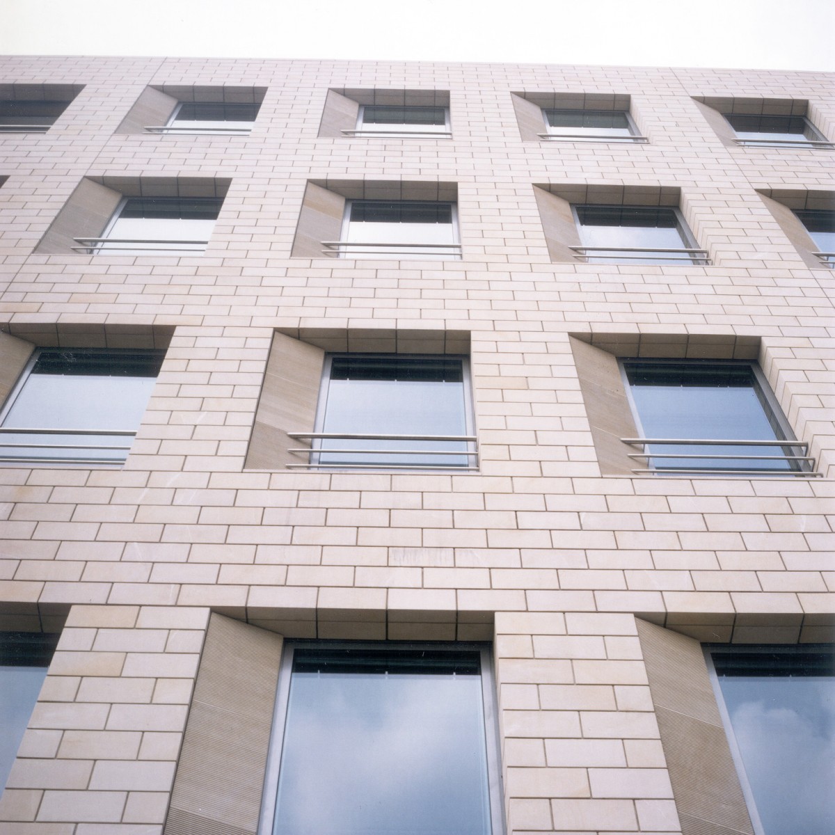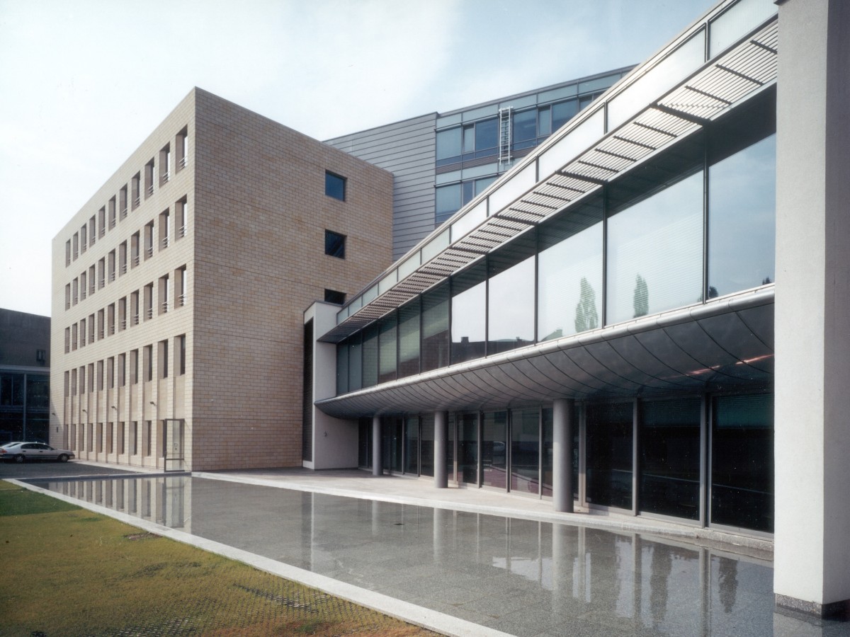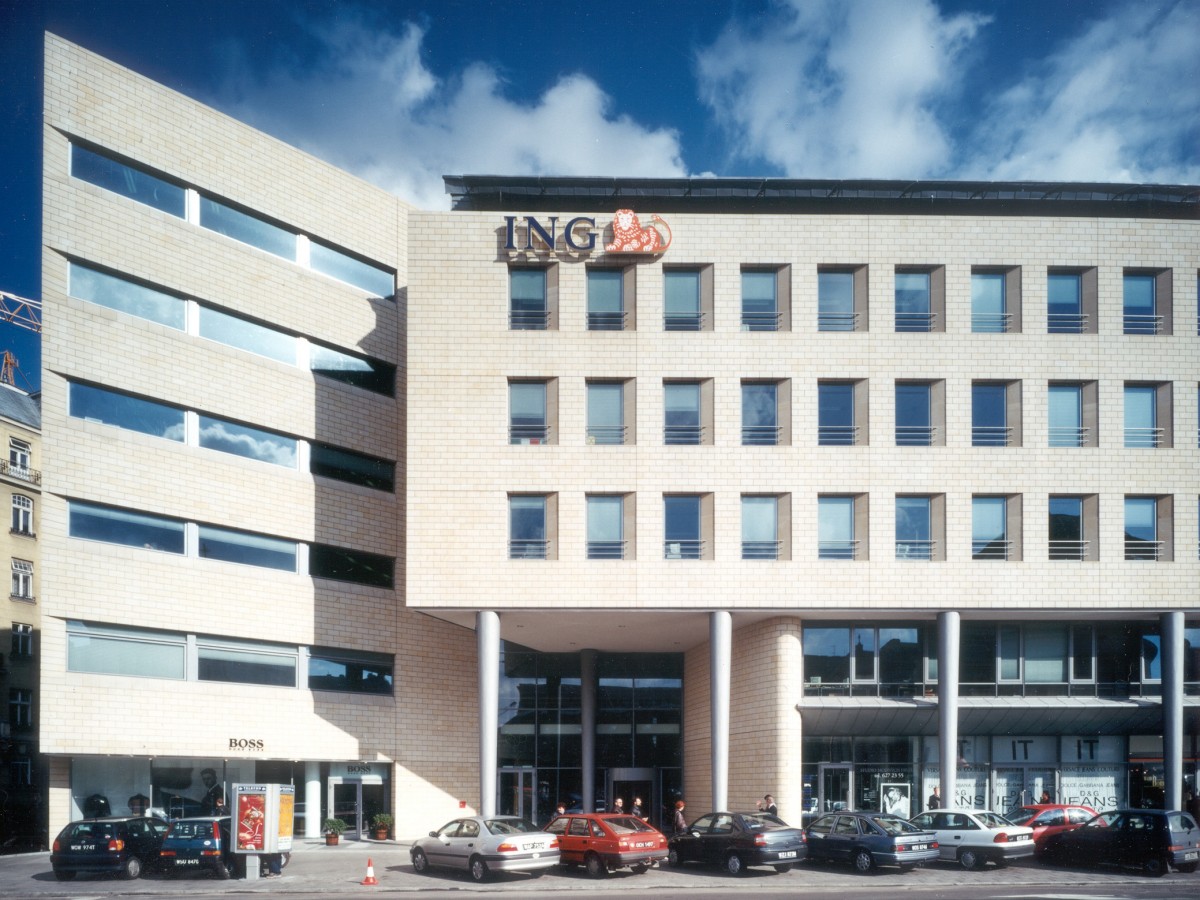 De zandstenen pleingevel van het bankkantoor is zodanig verticaal geleed dat elk van de drie geledingen op een ander schaalniveau functioneert. De teruggelegde dubbele winkellaag schept ruimte voor voetgangers, de regelmatige zandstenen gevel vormt een pleinwand, terwijl de dakopbouw pas goed zichtbaar is van enige afstand. De openbare doorgang naar de Villa Merlini wordt geflankeerd door een lagere aanbouw aan het Instituut voor Doofstommen: een ingenieuze overgang op het scherpst van de snede.
