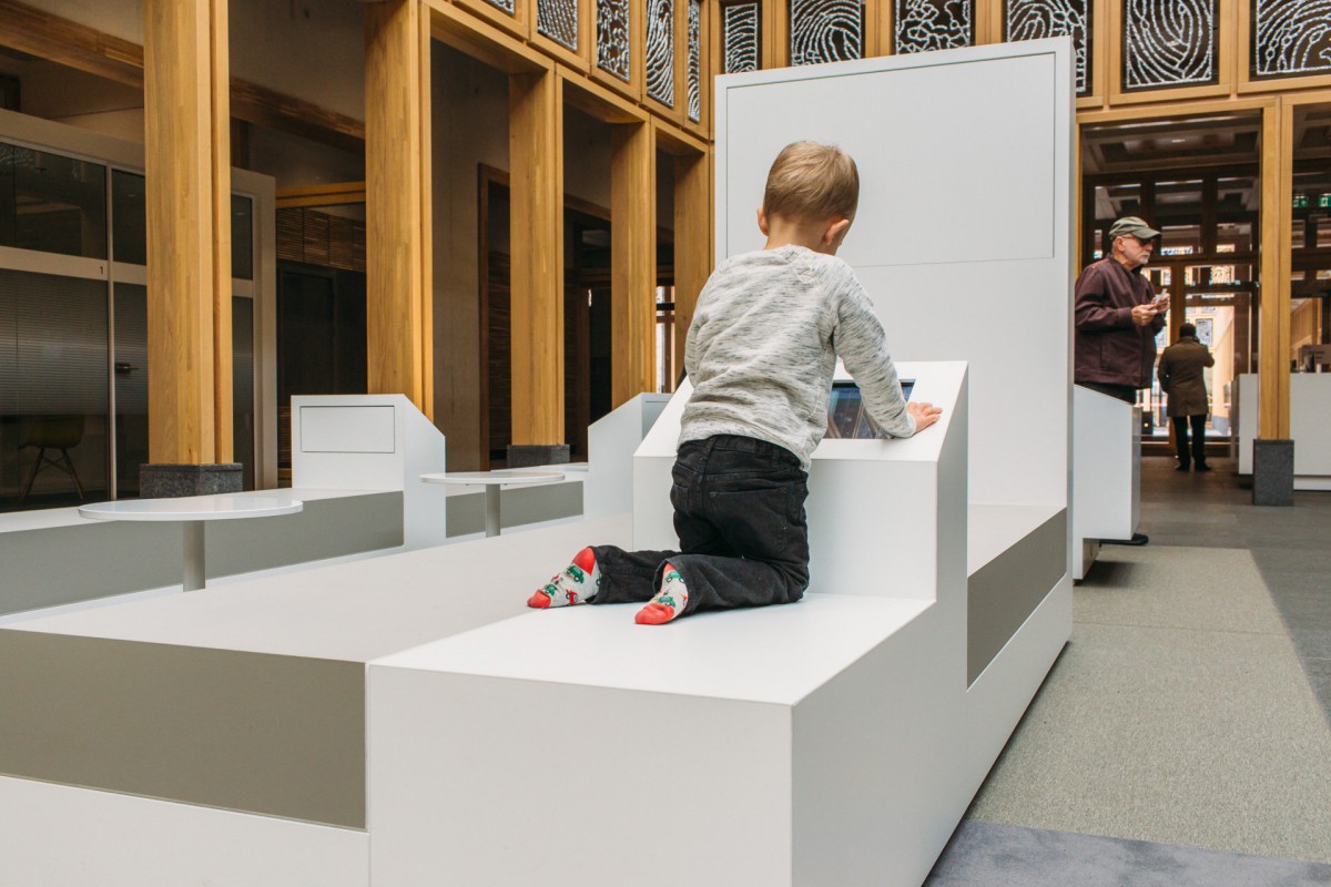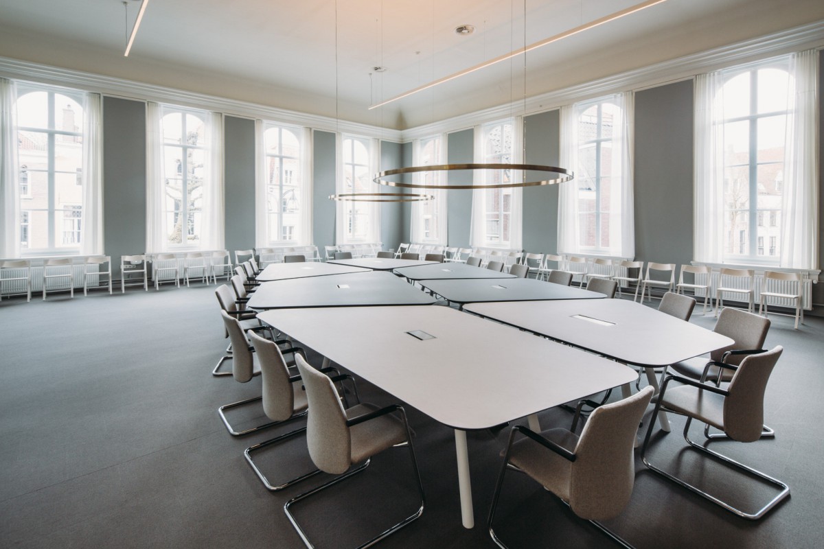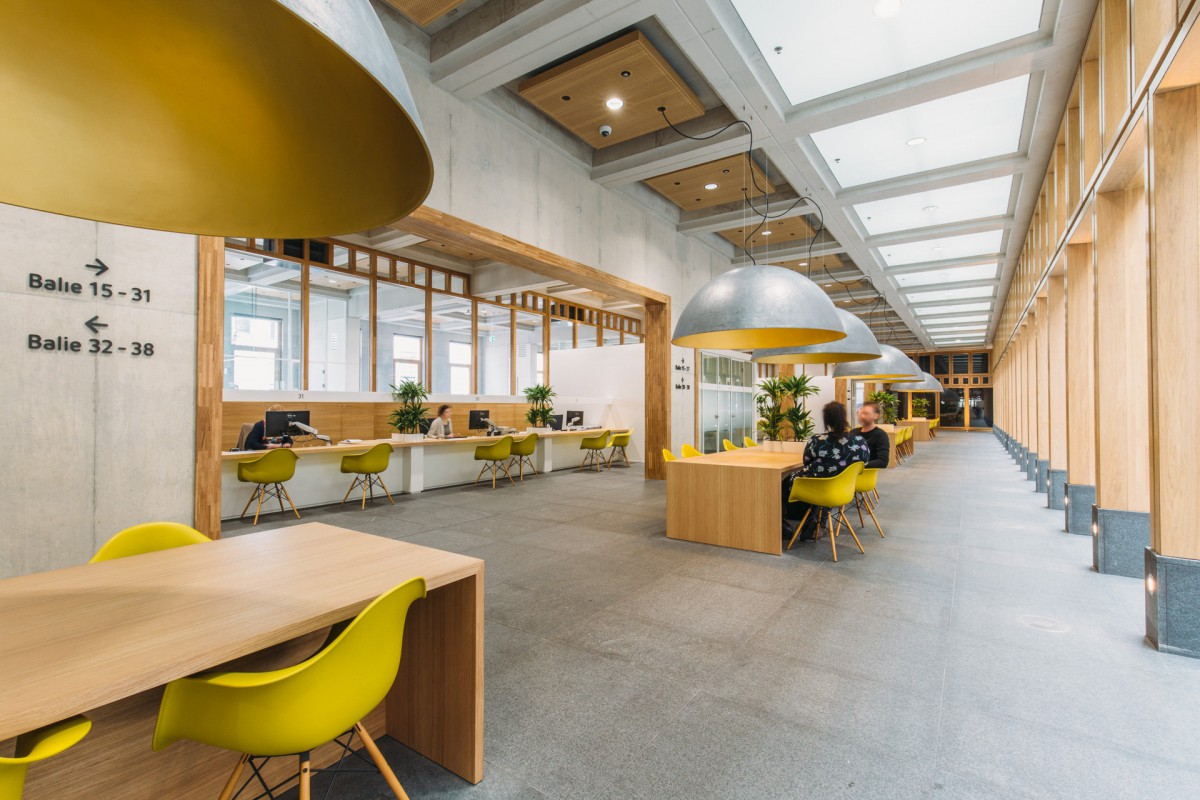 Atelier PRO heeft de inrichtingsplan gedaan voor het oude en nieuwe gebouw en de restoratie/renovatie van het nieuwbouw. In ons ontwerp voor het Stadhuiskwartier staat het vormgeven van keuzemogelijkheden centraal. Mensen die hier werken, kunnen kiezen uit werkplekken met een grote variatie. Bijvoorbeeld een short-stay plek: hier zit je max 2 uur. En ook als bezoeker heb je keuzes, zoals in de publiekshal. Wil je je paspoort op komen halen? Dan neem je plaats op een houten bank. Als voorbereiding op een langere afspraak kun je je terugtrekken in een rustige hoek. Dit hebben wij 'Het Nieuwe Wachten' genoemd.