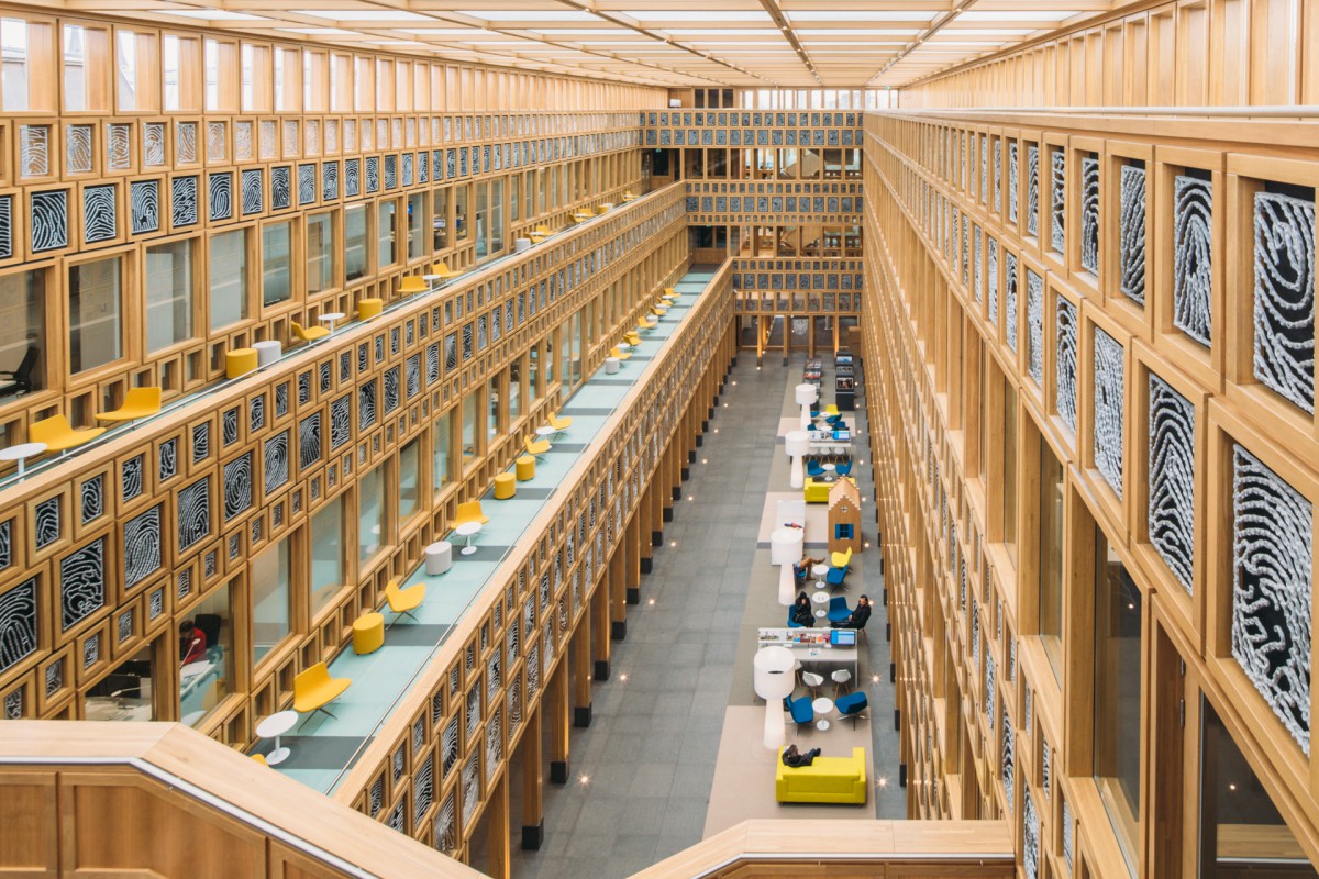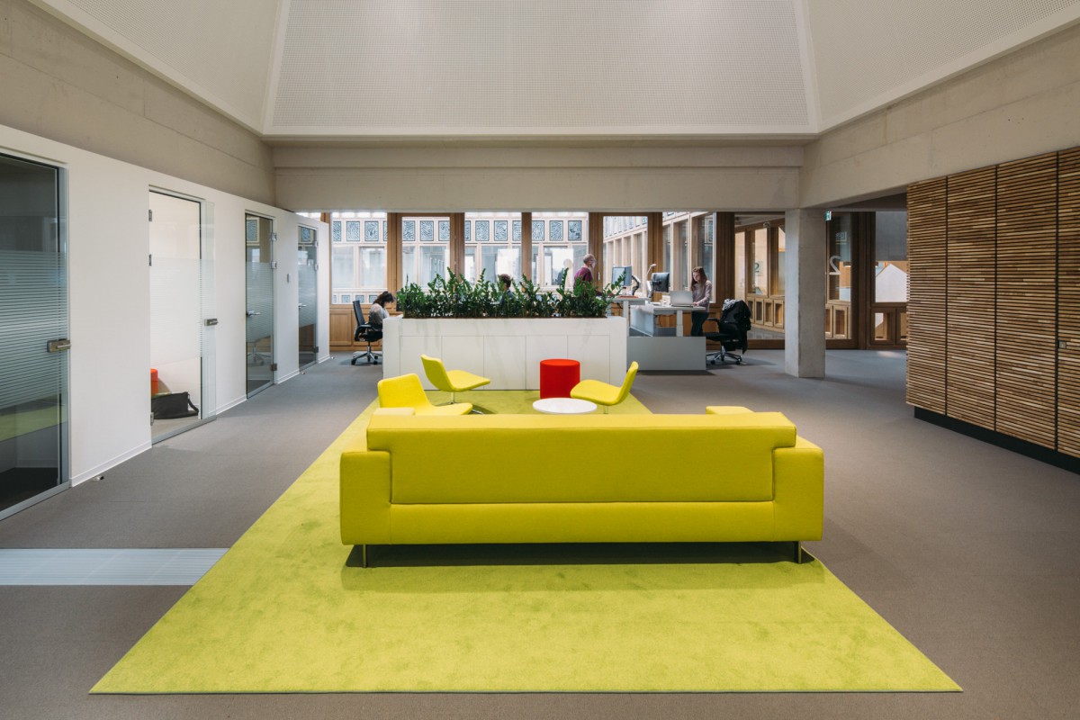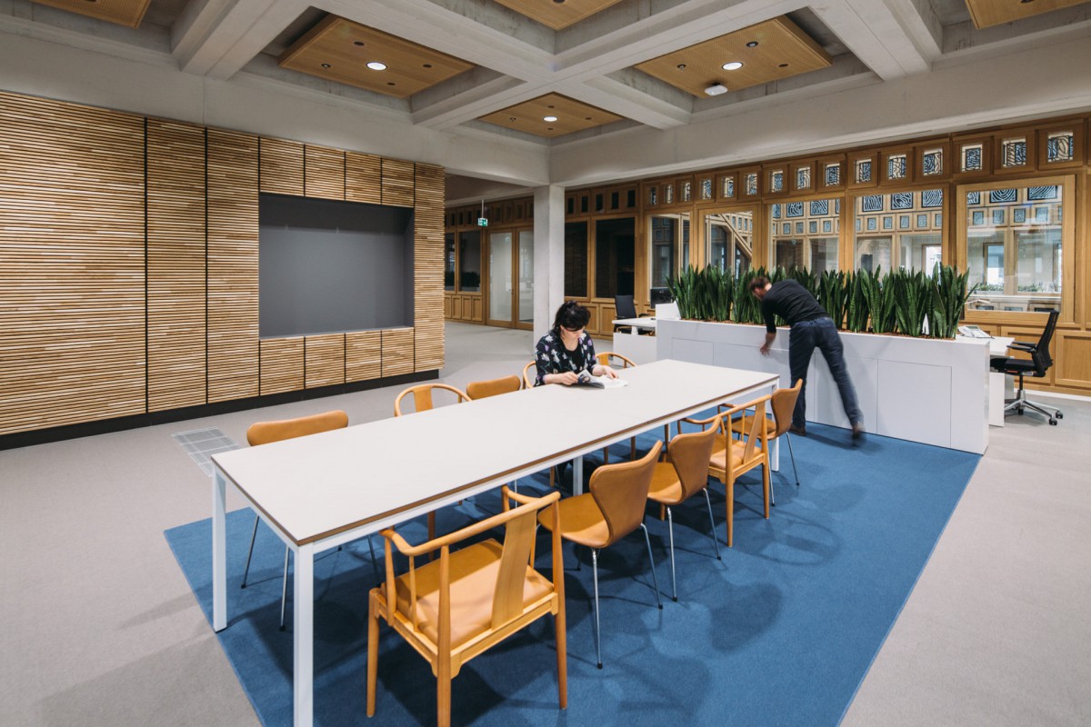 We zorgen voor veel variatie door zones te maken. Per zestig werkplekken is er een ‘huiskamer’ geplaatst, dicht bij de hoofdroute van het gebouw. Hier hang je je jas op, drink je koffie, klets je met je collega’s over het weekend en eet je taart als er iemand jarig is. Ook zijn er plekken waar je kunt zitten om een tekst te lezen, collega’s te ontmoeten of om te vergaderen. Verder weg van de hoofdroute wordt de werkvloer rustiger. Van een levendige plek waar je nog af en toe met een collega praat, tot stille plekken aan de uiteinden van het gebouw. Die overgang van dynamiek naar rust komt tot stand door de indeling van de werkvloer, zonder dat daar bordjes voor nodig zijn. We hebben onder andere vrijstaande ruimtes op de werkvloeren geplaatst, met daarin afgesloten concentratieplekken en vergaderplekken. Door het opdelen van de vloeren in kleinere delen is het ook daartussen rustiger.