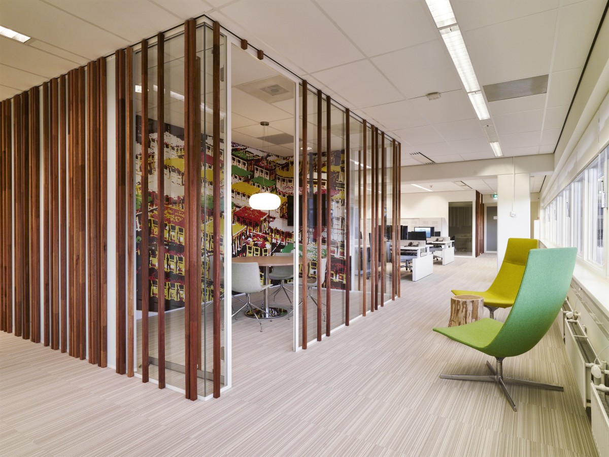De voormalige muffe kamertjes zijn vervangen door een open ruimte waar de bestaande karakteristieke kolommenstructuur weer mooi zichtbaar is en daglicht optimaal binnenkomt. Door het strategisch plaatsen van afgesloten ruimten voor concentratie of overleg, ontstaan luwtes tussen de gesloten delen waardoor prettige, rustige werkplekken ontstaan.