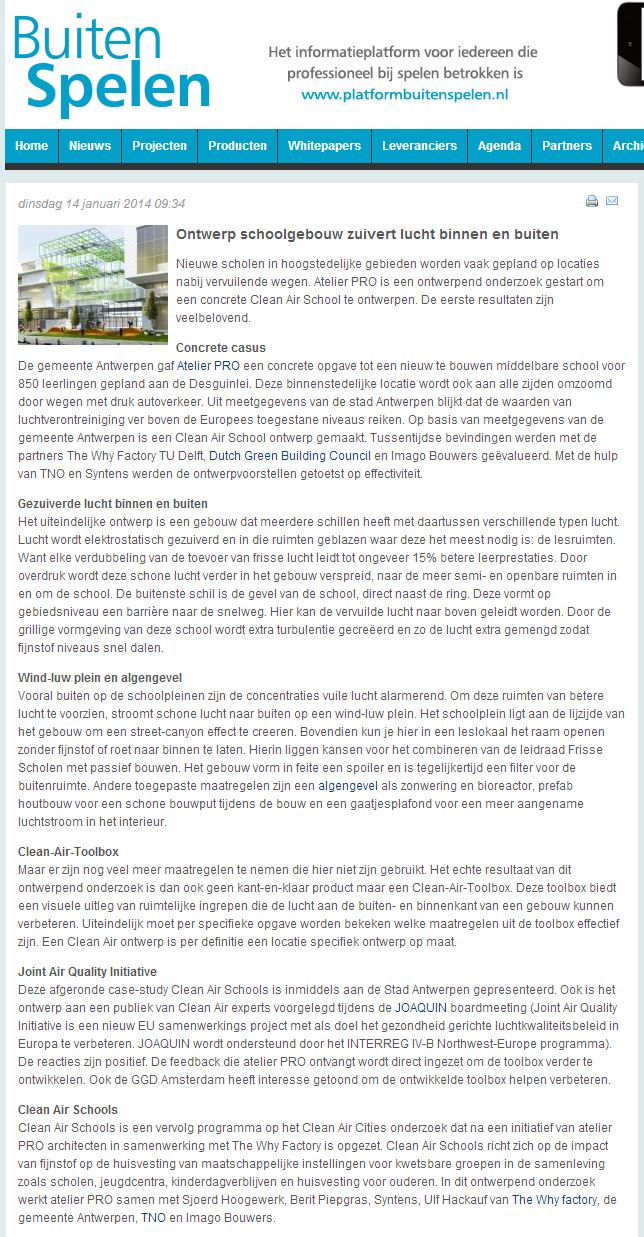 Op deze manier zorgt het ontwerp voor de mogelijkheid om een raam te openen van het leslokaal naar de overdekte semi-publieke ruimte om de school zonder fijnstof of roet naar binnen te laten. Hierin liggen kansen voor het combineren van het programma 'Frisse Scholen' met passief bouwen. Naast de genoemde maatregelen is in het ontwerp alles eraan gedaan omeen energieneutraal en prettig schoolgebouw te creëren; zoals toepassing van een algengevel als zonwering en bioreactor, prefab houtbouw voor een schone bouwput tijdens de bouw en een aangenaam binnenklimaat en een 'gaatjesplafond' (voor een aangenamere luchttoestroming binnen). Ook reductie van emissie van schadelijke stoffen uit bouwmaterialen en meubilair is een voorwaarde. Vervolgstappen We hebben met Ulf Hackauf van The Why Factory en Annemie Tormans en Jan Bel van Stad Antwerpen uitgebreid het ontwerp besproken waar vervolgens weer een reeks goede ideeën naar voren kwamen. Het ontwerp is in september 2013 gepresenteerd tijdens de JOQUIN conferentie voor een publiek van clean air experts. De reacties waren enthousiast. De algemene strekking is echter dat het voorspellen van luchtstromen erg lastig is. Daarom is vervolgonderzoek in windtunnels en zelfs het daadwerkelijk realiseren van een prototype noodzakelijk om goede resultaten te kunnen boeken.