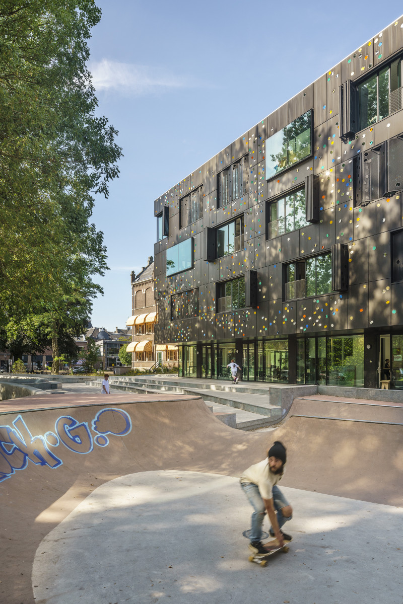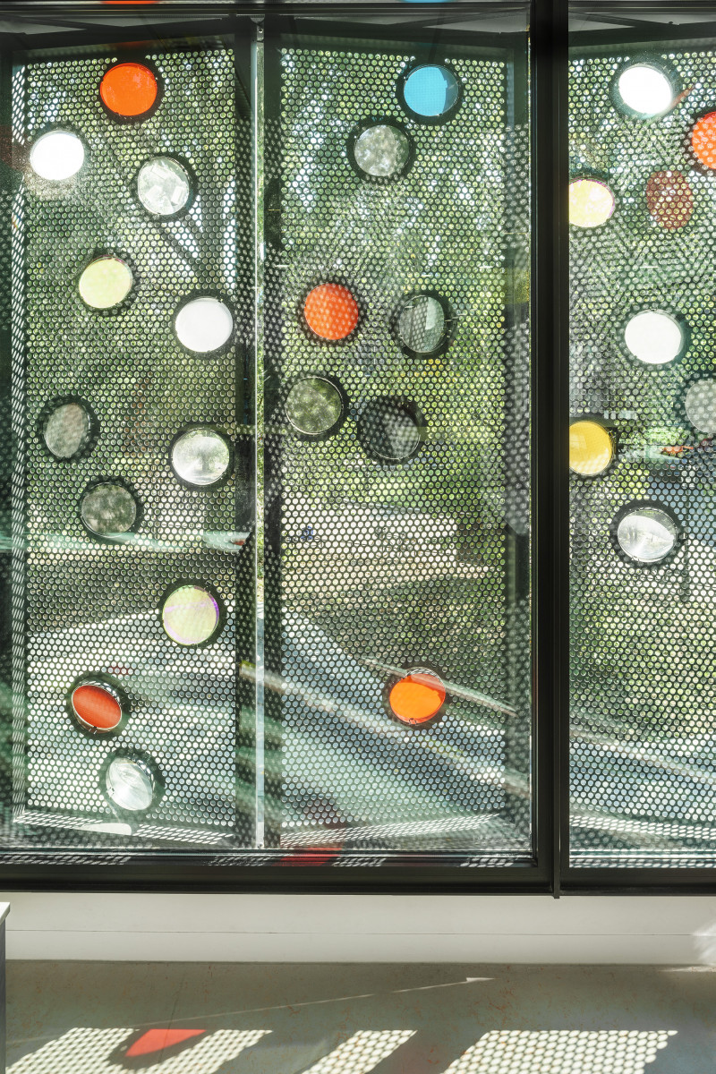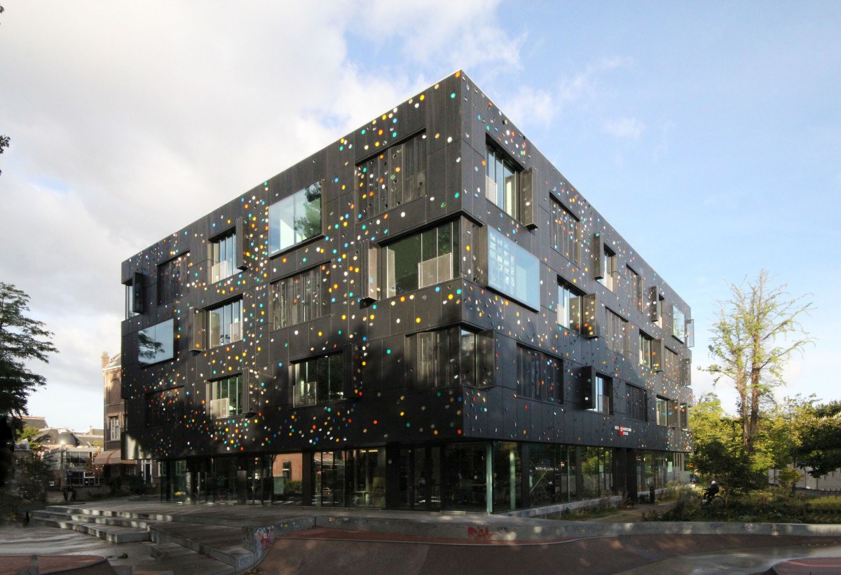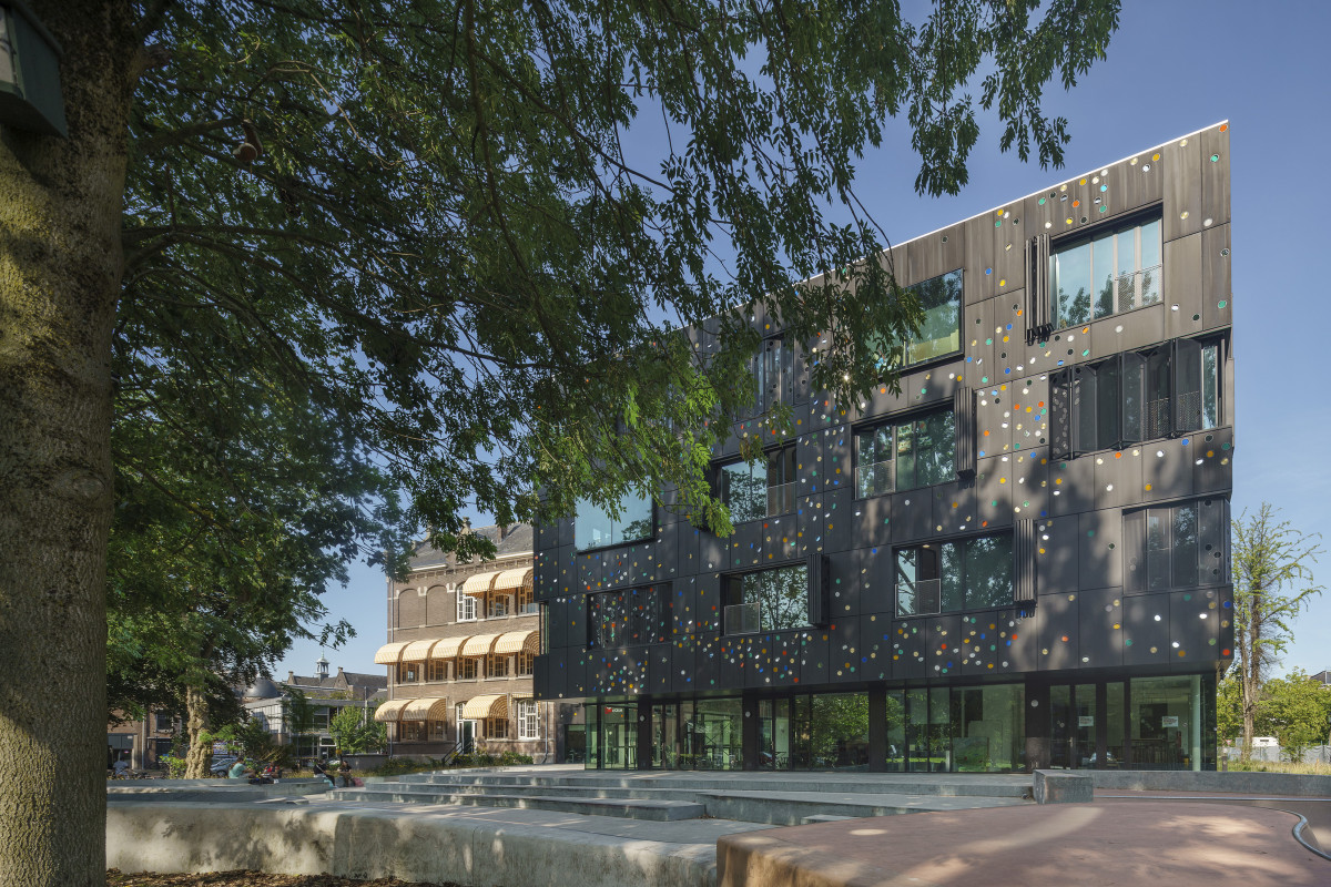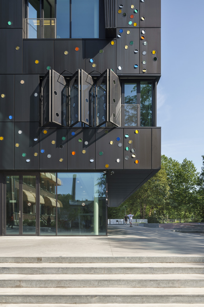 De gevel is voorzien van een opvallende, zwart geperforeerde panelen. Deze elektrisch bedienbare panelen fungeren als zonwering en zijn onderdeel van het kunstwerk ‘Here Comes The Sun’ van Chris Kabel. Hij heeft 4.500 transparante glazen lenzen en filters in diverse kleuren aangebracht in deze panelen. De lichtinval zorgt hierdoor voor een diffuus speels lichteffect in de klaslokalen. Het patroon van de lenzen verwijst op een afstand van het gebouw naar het golf- en deeltjeskarakter van licht.