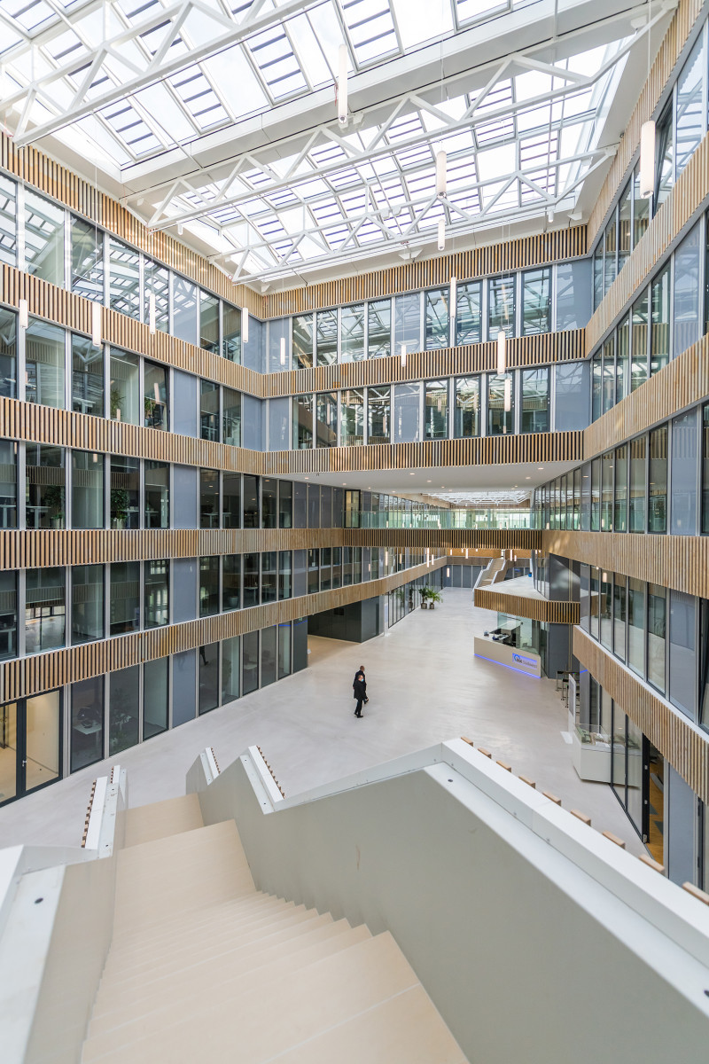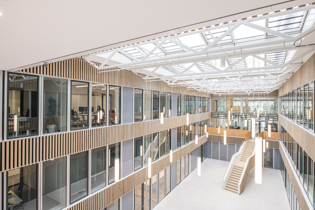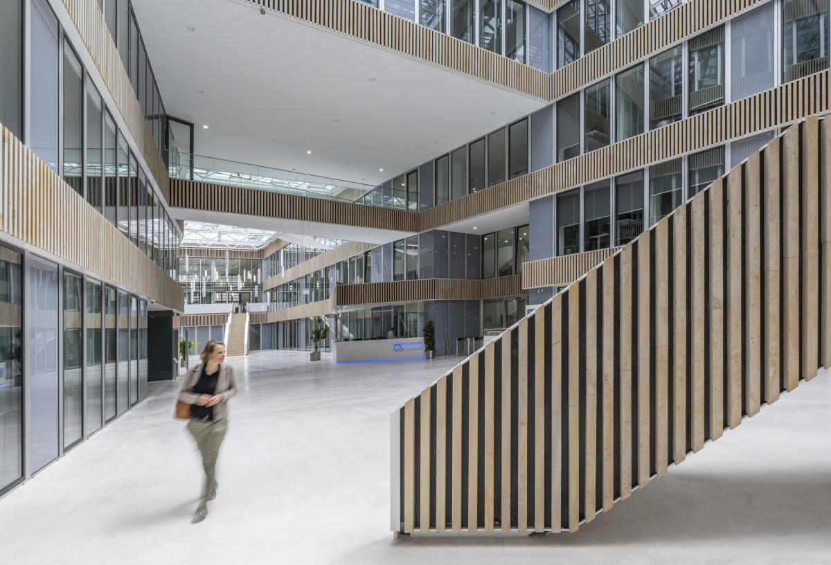 De kantoorruimten zijn gegroepeerd rond een atrium dat als verbinding- en ontvangstruimte dient. In de west- en oostvleugel zijn communicatiezones met twee verdiepingen gecreëerd, die onderling via een vide met elkaar zijn verbonden en door grote glasvlakken een visuele verbinding vormen tussen de binnen- en buitenruimten. Tegenover het hoofdgebouw staat het bijgebouw, dat hoofdzakelijk dienst doet als kantoorruimte.