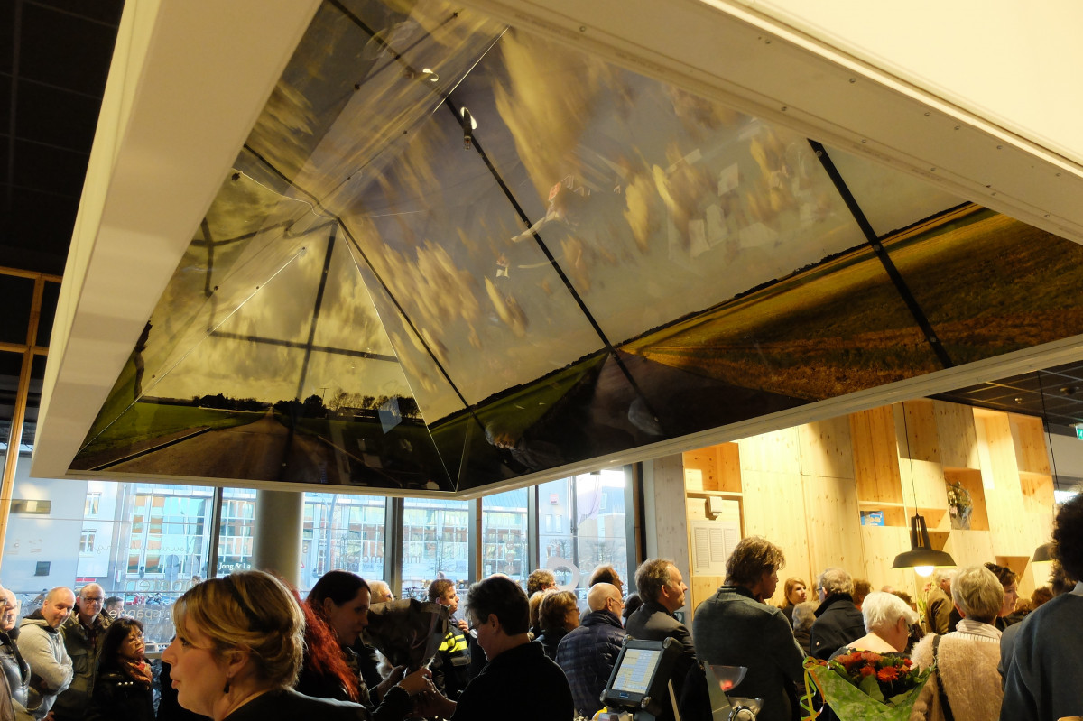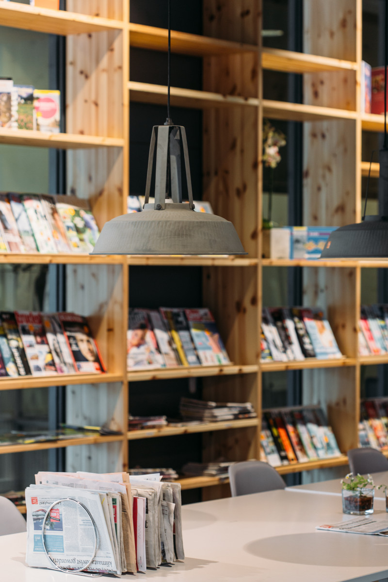We hebben voor het serviceplein gezocht naar een sfeer die enigszins stoer maar ook uitnodigend en “gezellig” is. Passend bij Dronten. Aansluitend op de grote hal van de Meerpaal is de vloer grijs en het plafond donker gemaakt. De sfeer wordt bepaald door de inrichting met vast meubilair zoals de kastenwanden, het podium en de bibliotheekmeubels die veelal van mat gelakt grenenhout zijn gemaakt. De bar/balie moest er uitnodigend en laagdrempelig uitzien en herkenbaar in de hele ruimte. Daarom is deze helemaal wit. Boven de balie hangt een wit dak in de vorm van een huis. Een symbolische en herkenbare markering van de balie die de medewerkers een gevoel van geborgenheid geeft en de bezoeker verrast doordat de panorama foto aan de binnenzijde langzaam zichtbaar wordt.