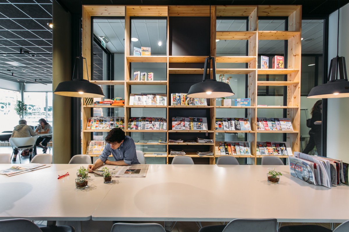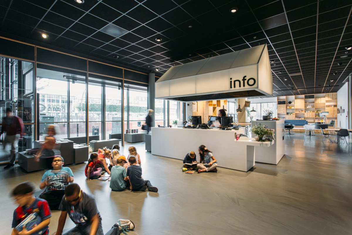 De hele rij (beperkt bemande) loketten die in de entreeruimte van de bibliotheek lagen, is vervangen door een zogenaamd serviceplein. Een open, multifunctionele ruimte met een vrij in de ruimte staande balie waar mensen terecht kunnen voor theaterkaartjes, bioscoopkaartjes, vvv bonnen, bibliotheeklidmaatschap, algemene informatie én koffie. Een deel van het serviceplein is ingericht als leescafé en ontmoetingsruimte met een podium, hoge en lage leestafels, tijdschriften en kranten en een huiskamerhoek.