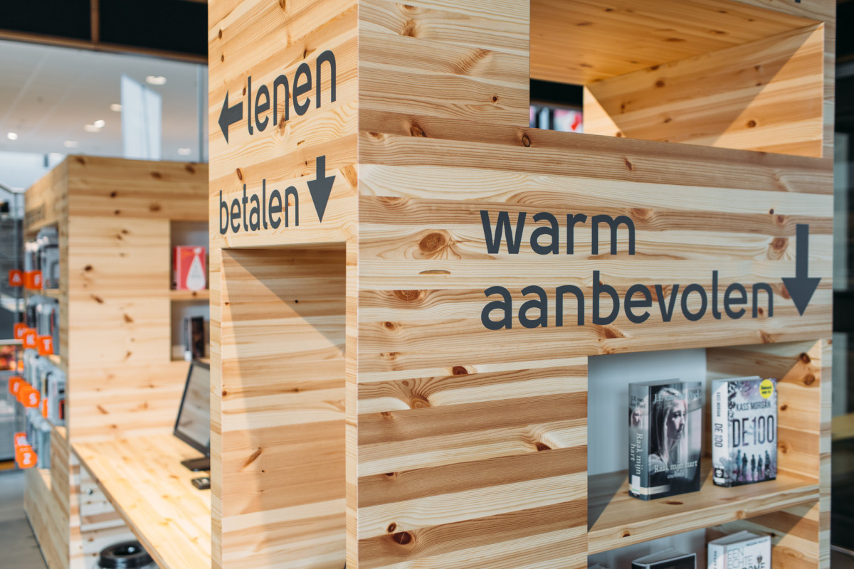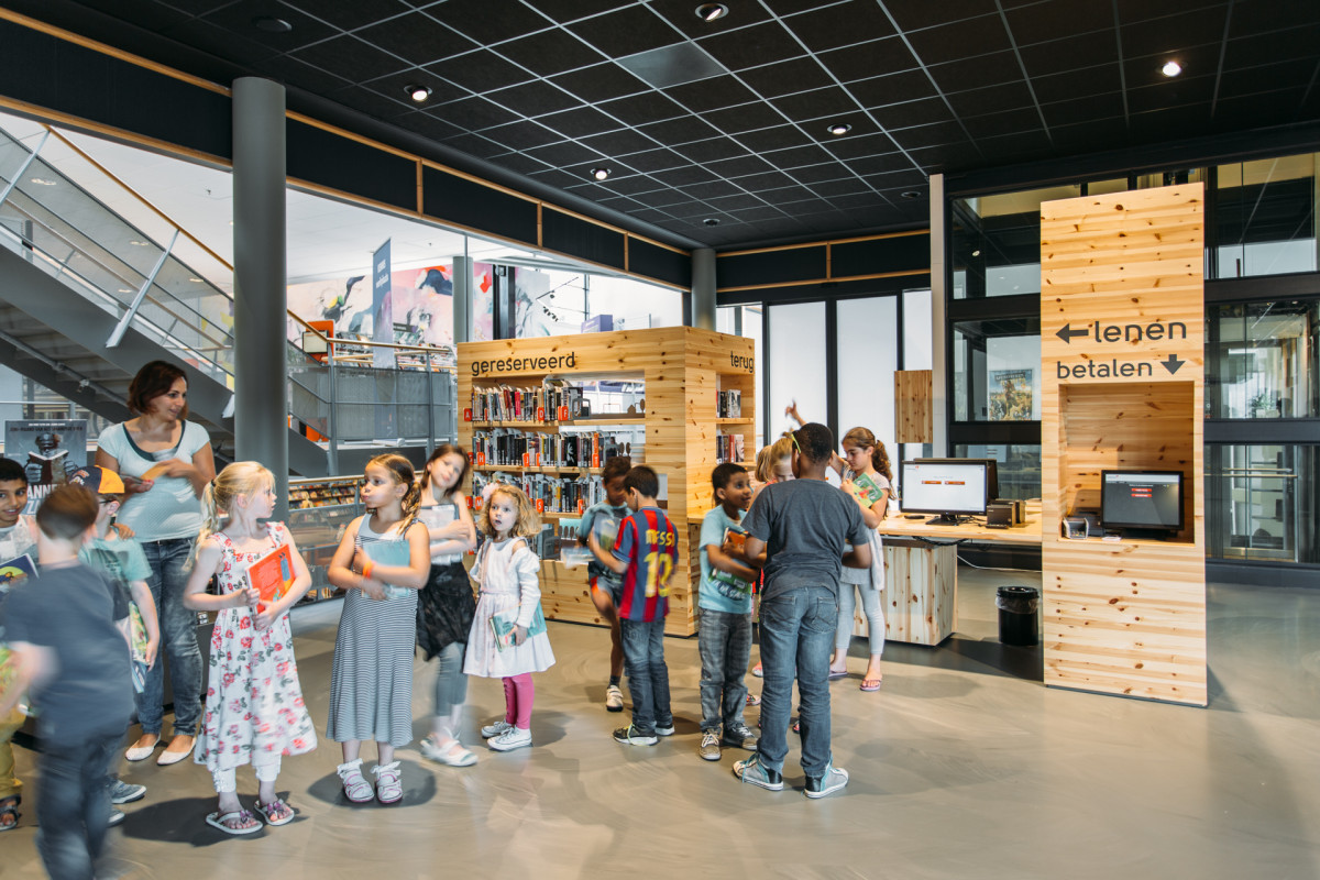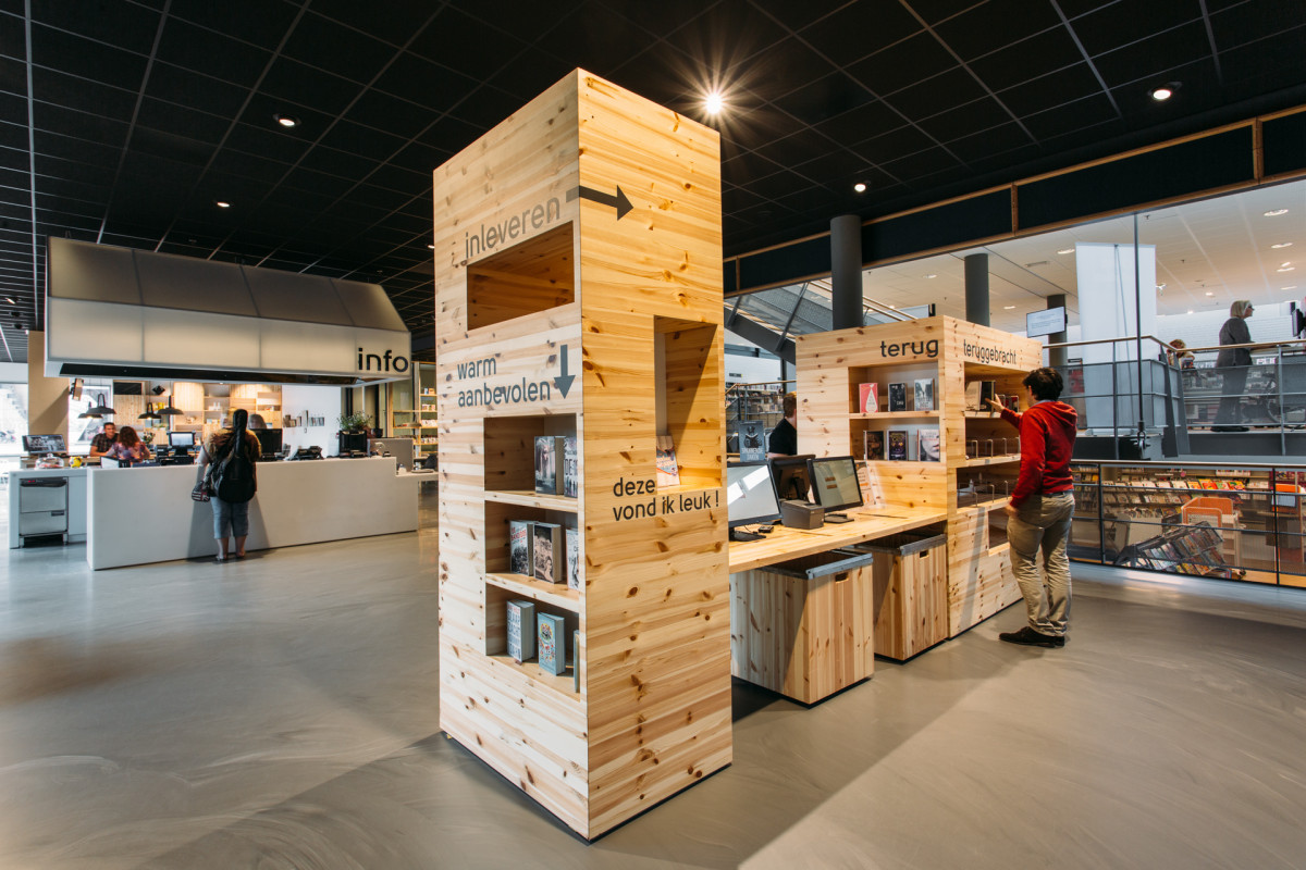 Het serviceplein vormt nog steeds de entree voor de bibliotheek maar in de nieuwe situatie is de overgang veel vloeiender. Verspreid in de ruimte bij de entree staan verrijdbare displaymeubels waar met name de bibliotheek gebruik van maakt om zichzelf, aan de hand van thema’s, te presenteren en de bezoeker te verleiden binnen te komen. Dit sluit aan bij het retailconcept dat in de bibliotheek is toegepast. In de entreezone staan ook de op maat gemaakte meubels waar mensen hun boeken kunnen retourneren of inscannen om te lenen.