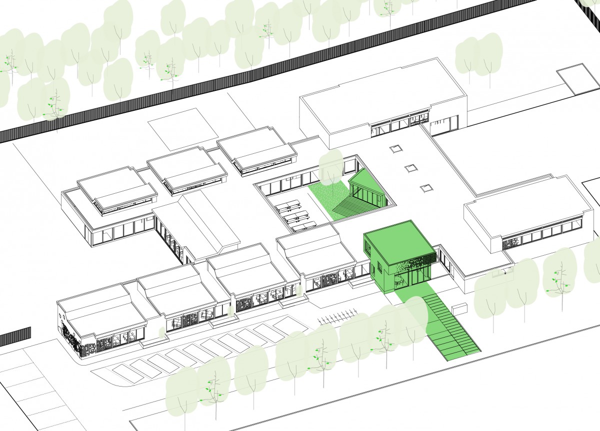 Belangrijke ingreep is het introduceren van een as die entree, gebedsruimte en patio met elkaar verbindt. De groene loper. Deze zone begint vanaf de stoep in de vorm van bestrating, neemt het bestaande brievenbuselement mee en de entree wordt getransformeerd tot een karakteristiek beeldbepalend volume. Hierin ligt onder andere de nieuwe entree en wordt je blik, op de plaats van de patio pui, vastgehouden door een fraai scherm. Vanaf hier kun je kiezen naar welk lokaal je gaat en kijk je verder naar de patio en de gebedsruimte. Voor het entreevolume is de kleur groen gekozen. Groen is eveneens de accentkleur in het interieur. Rust voert de boventoon in het interieur en is vertaald naar het gebruik van veel wit, met groene accenten en hout accenten.