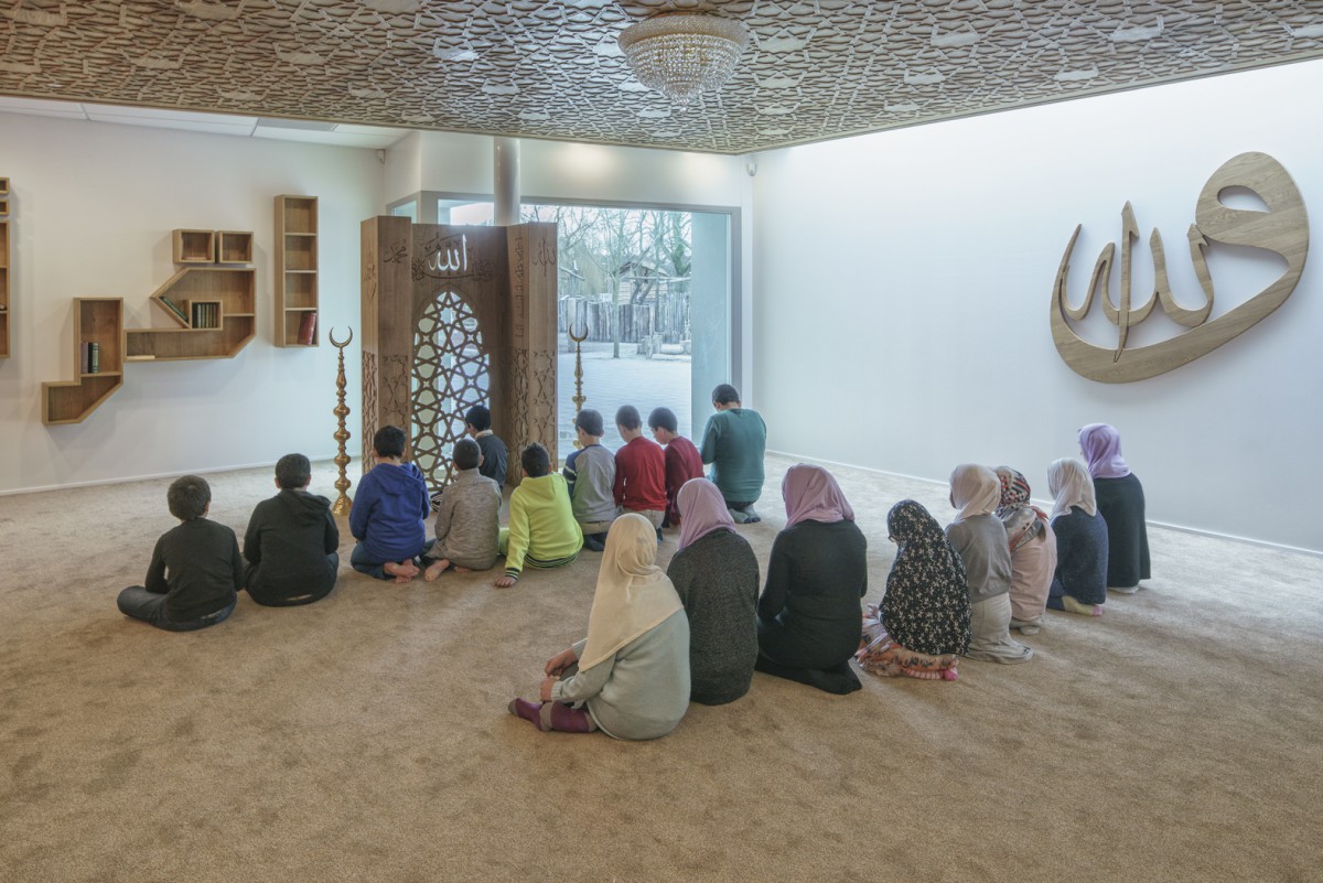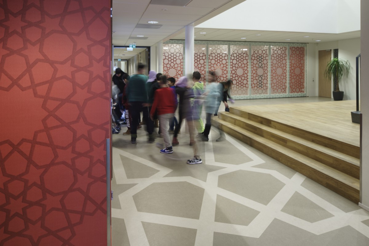 Aan de buitenzijde onderscheiden de scholen zich verder door geperforeerde raamschermen, met bijzondere geometrische patronen en basiskleuren. De Islamitische school heeft drie tinten azuur blauw in haar kleurenpalet. De patronen zijn geïnspireerd op de binnenramen van een moskee vlakbij Cairo, Egypte. De openbare school heeft verschillende aardetinten in een patroon dat een organische variant is van de moskee.